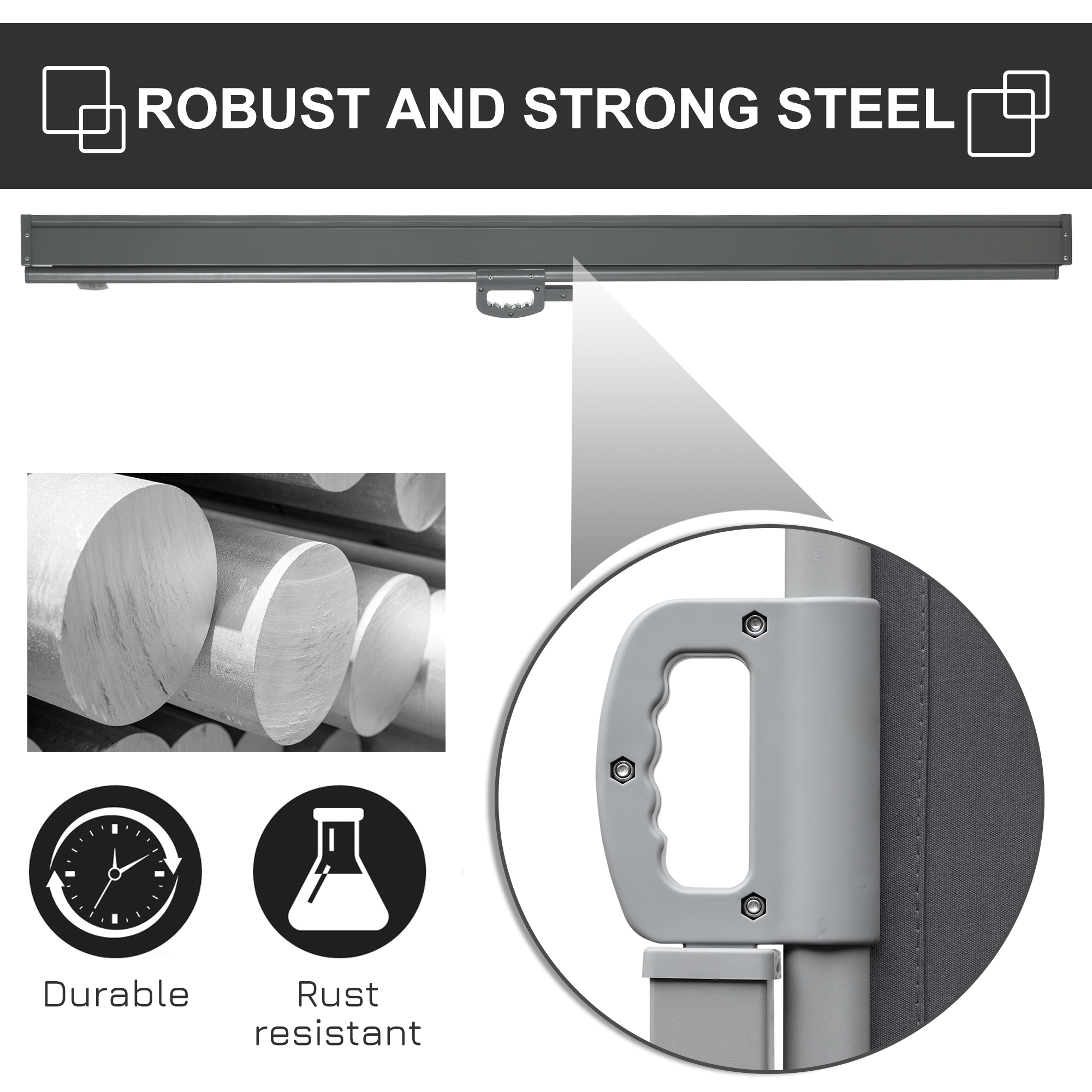 - Easy to use and set up: simply position and fix the two steel frames to cement/solid wood, where the canopy will extend and fix from a steel post to the other securely