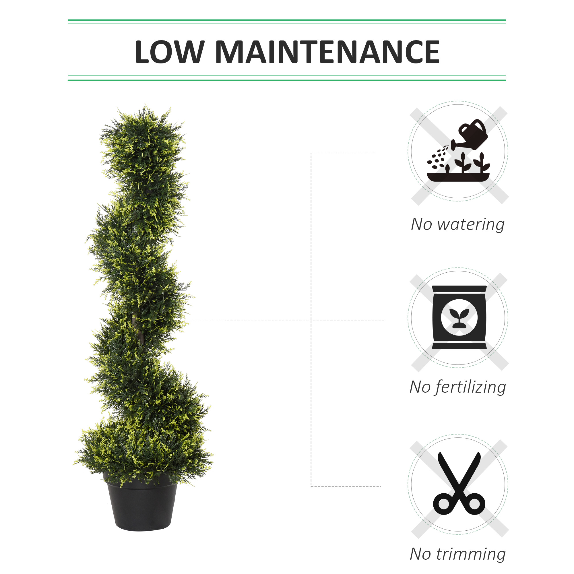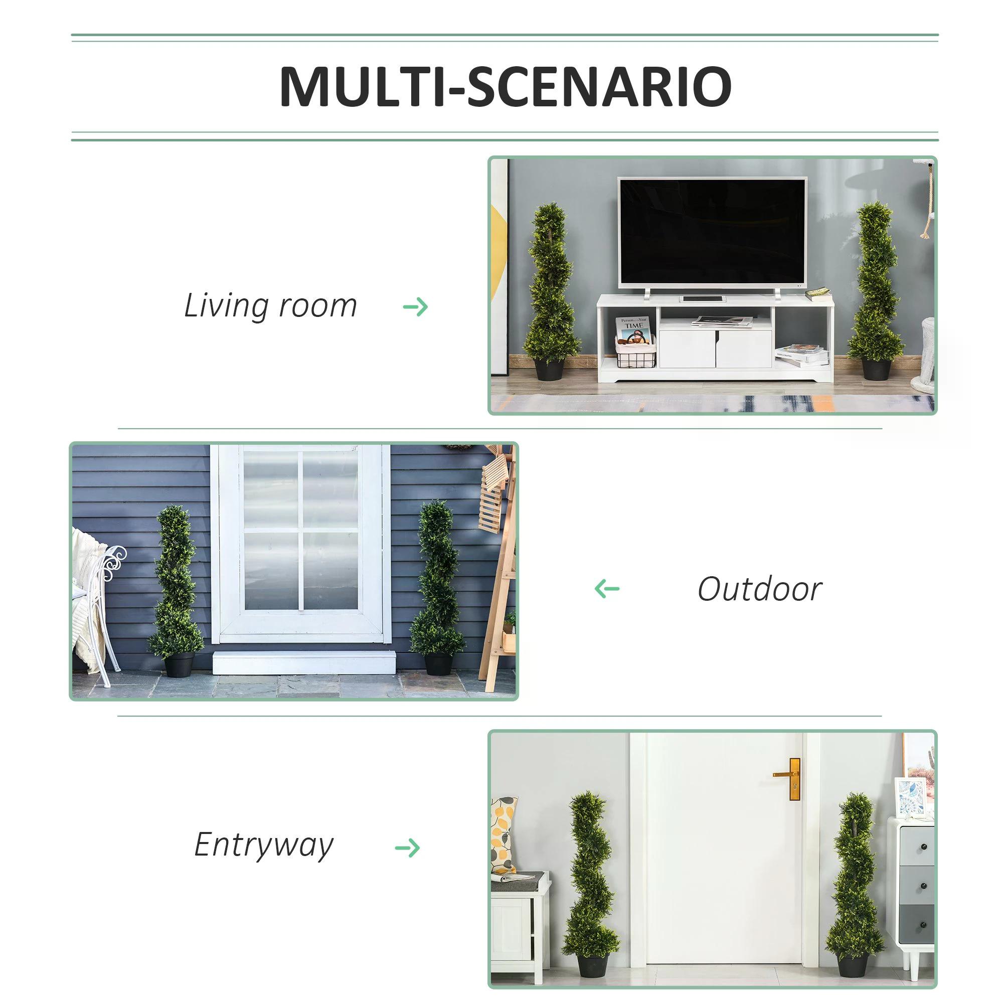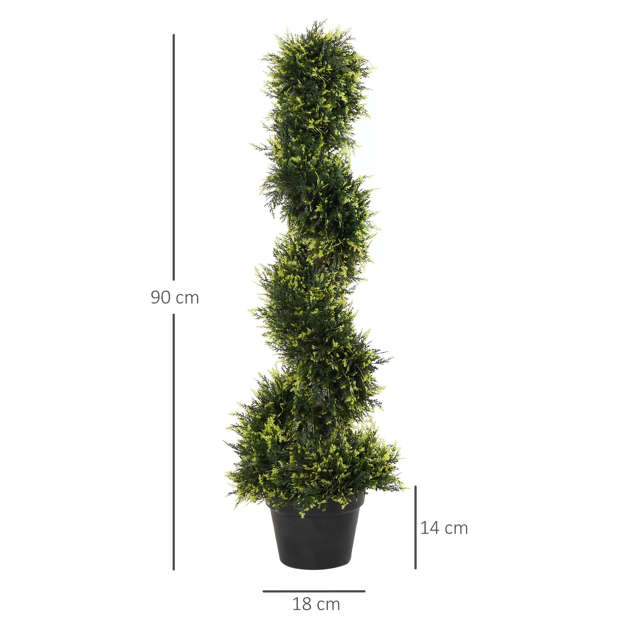 Bringing beautiful greenery into your home doesn't get much easier than this. These 2 potted plants will liven up your space without maintenance. Come in a set of two, so you can create a matching look in the home s. Made from plastic for long-time use, the premium quality holds a realistic colour. The fake tree is tall, and the spiral shape adds to the beauty. Our indoor plants both come with a pot, so you have everything you need in the package.