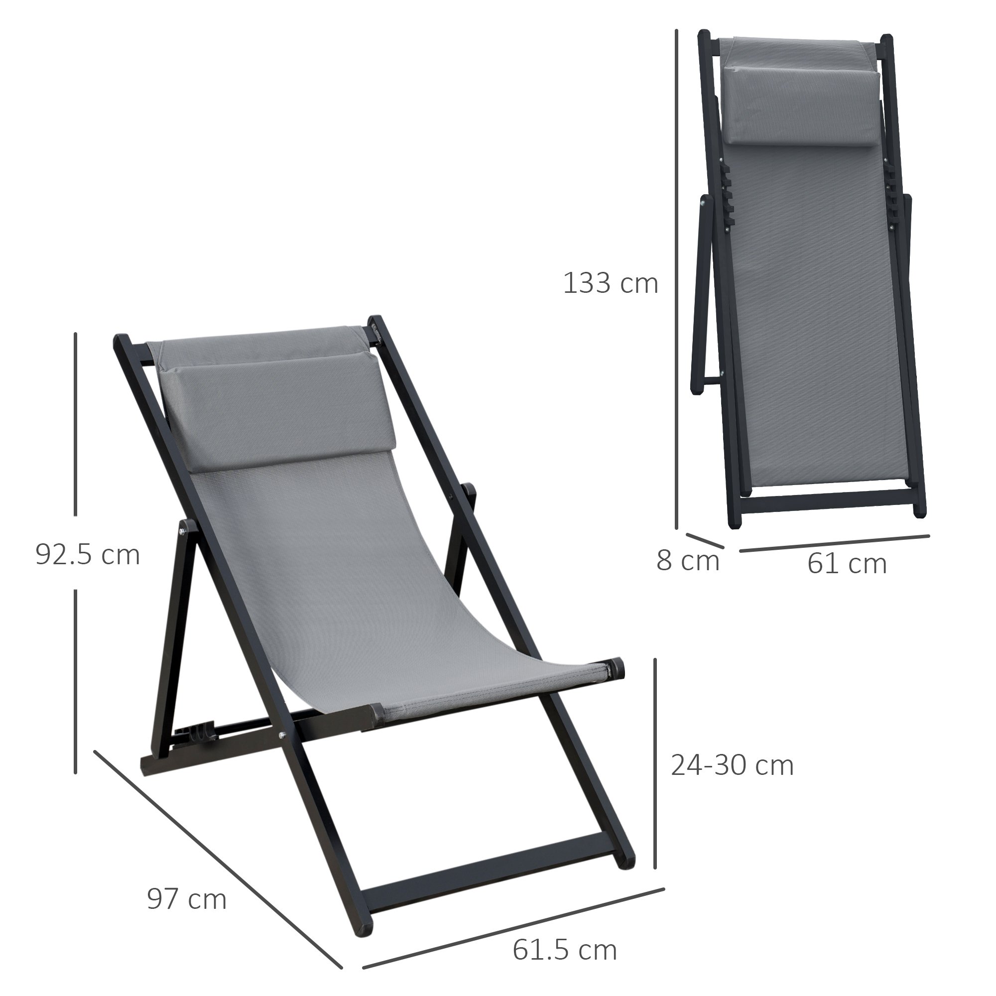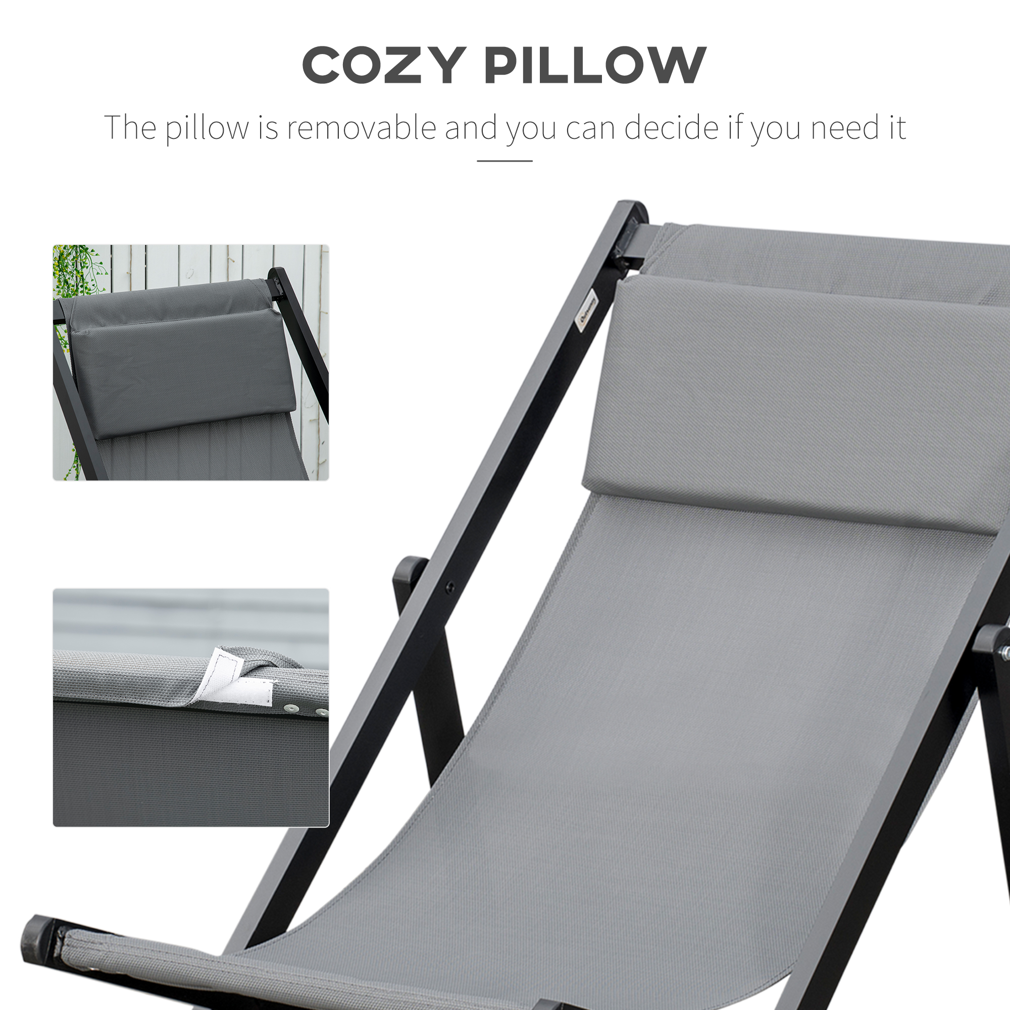 Be ready for the warmer weather, with these two Outsunny reclining garden chairs. Aluminium frames are strong and supportive - they are foldable too, so you can carry and store them around easily. The back can be set to five different positions - lean back to an angle which suits. Fabric seats to hold your body, complete with a pillow for head/neck comfort and support.