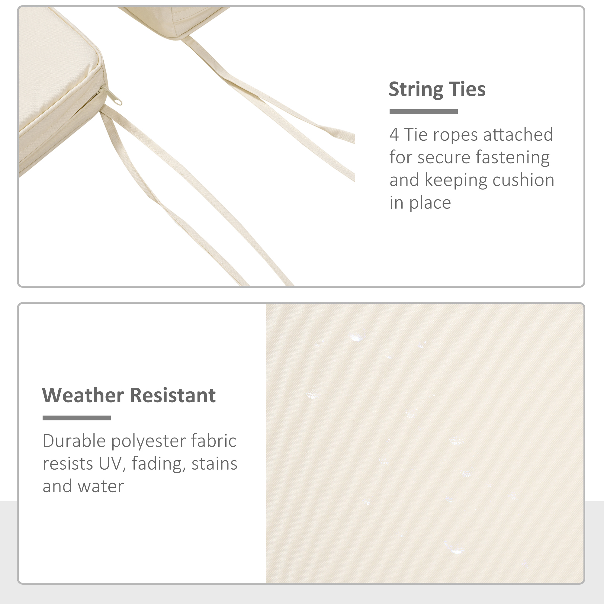 New comfort for garden and outdoor furniture - this set of two garden cushions, from Outsunny. Each is filled with supportive padding for comfort. Polyester fabric covers are soft on the skin, can be spot cleaned for hygiene. Two tie fastenings to hold the outdoor seat cushion in place. Comfort and style in your garden, refreshed.