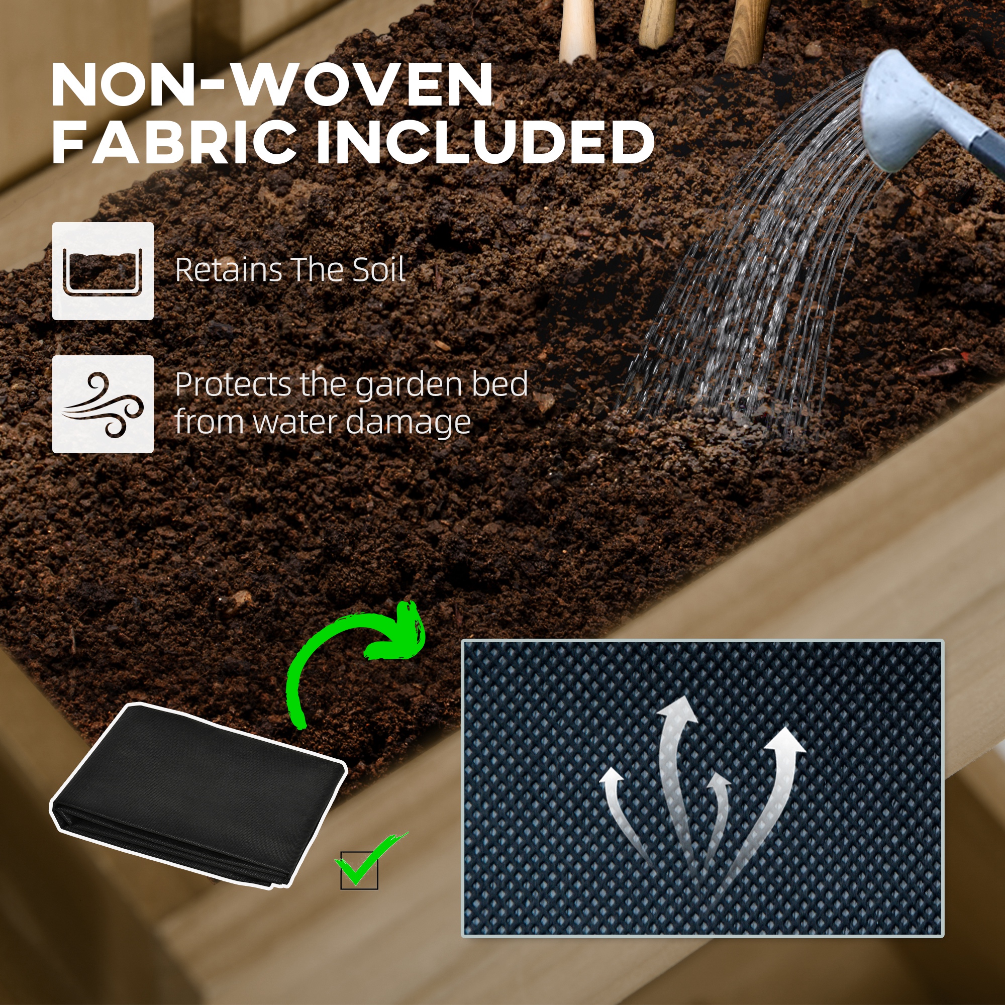 - Soil bag and drainage holes in each planter box