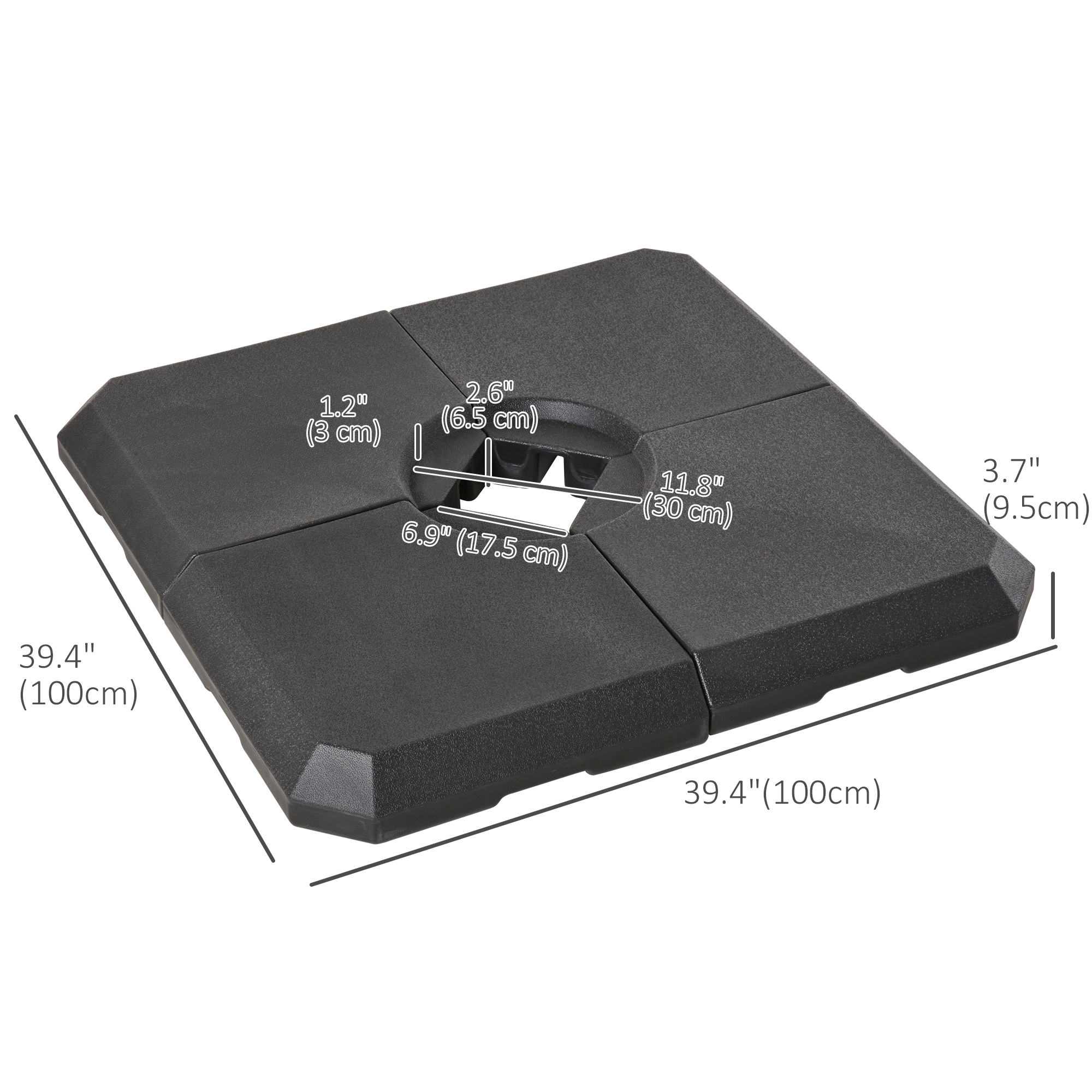 - Four-piece set, with all pieces slotting together on a cross base for parasols • Filling holes on each side, each piece fills to a maximum of 20kg water or 30kg – making it easy to store and carry when empty