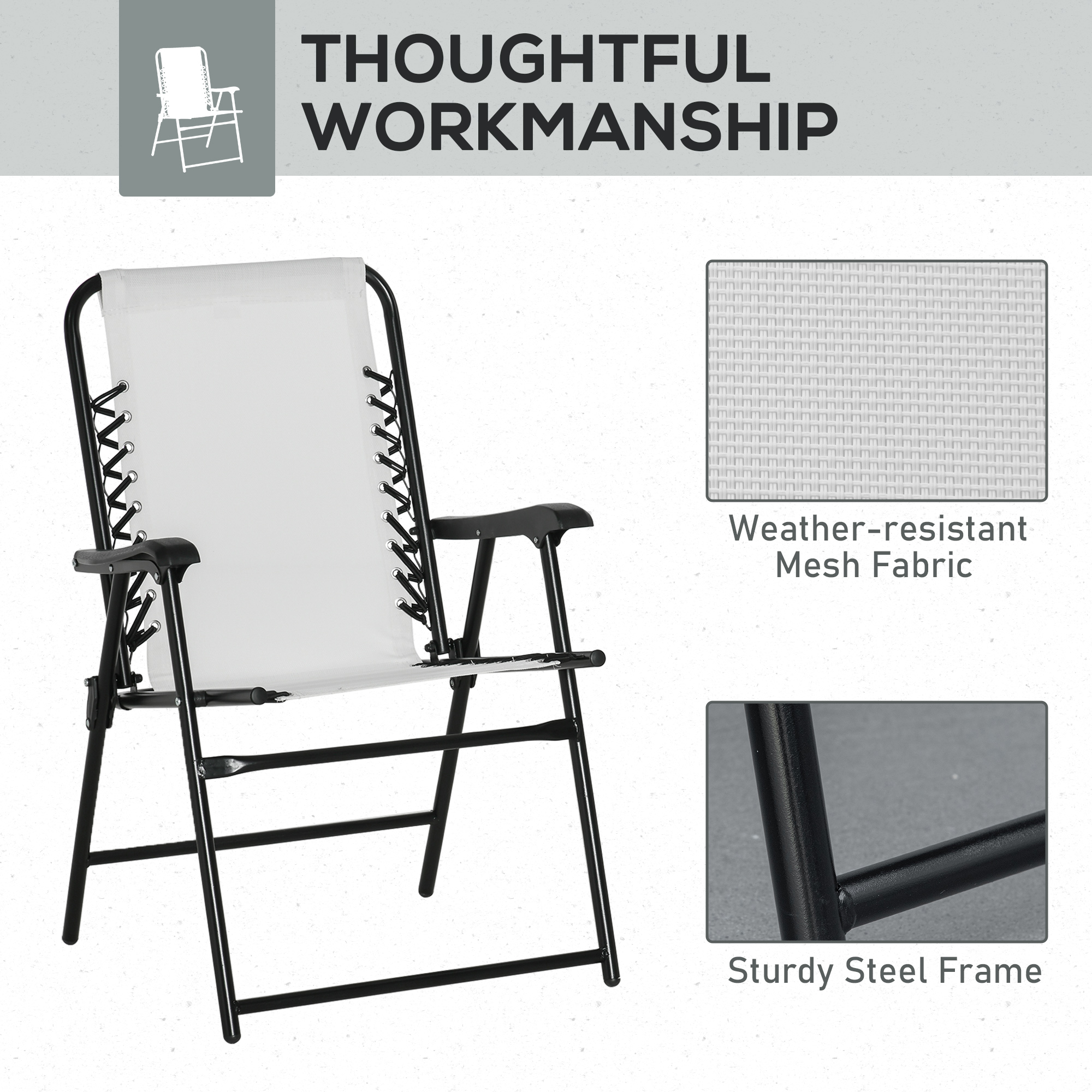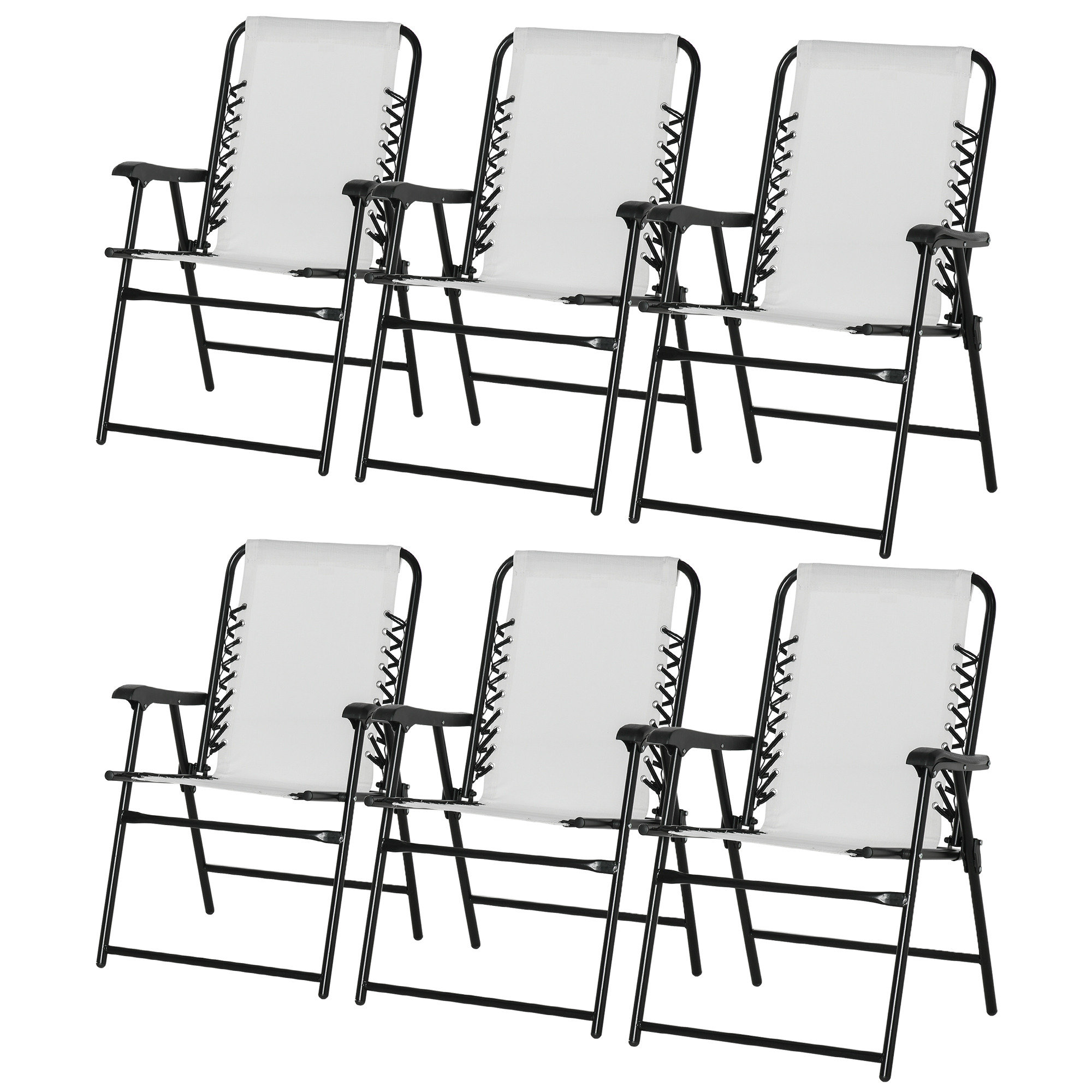 This six-piece outdoor folding chair set from Outsunny is great for any gathering, both indoor and outdoor. The garden chair frames are made from powder coated steel for a strong, supportive structure. Mesh fabric seat holds your body comfortably, the high back and armrests give you support. Lightweight and foldable, each chair is easy to carry and store. Spend no time assembling; sit back and relax!
