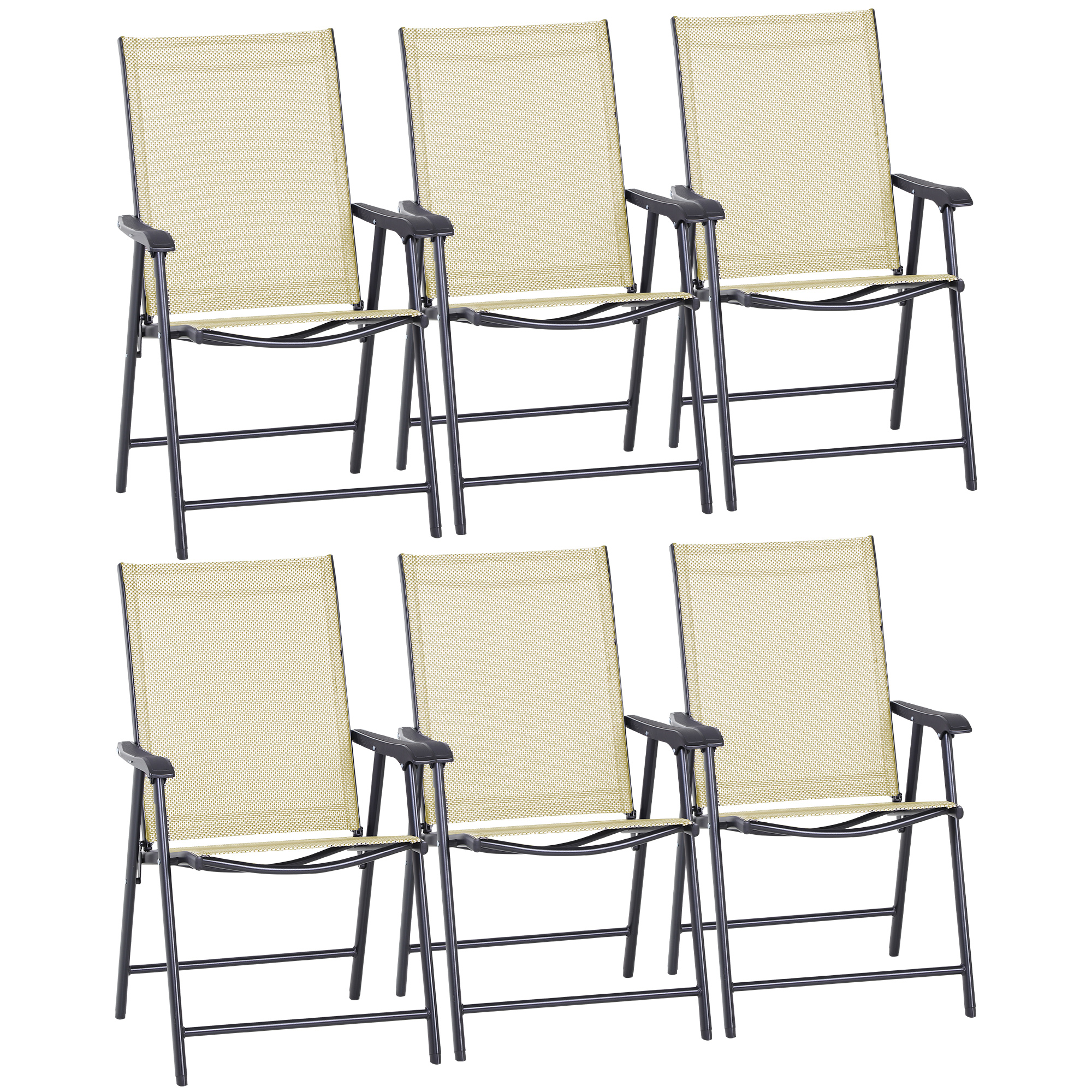 Never be stuck for a seat again, whether you're home or away, with this set of six Outsunny folding chairs. Using metal with a powder coating for extra strength and durability, both frames are fitted with texteline panels for your skin to breathe - great for the hotter days. With a tall, slightly tilted back, wide seat and mid-rise armrests, all chairs will support you properly.
