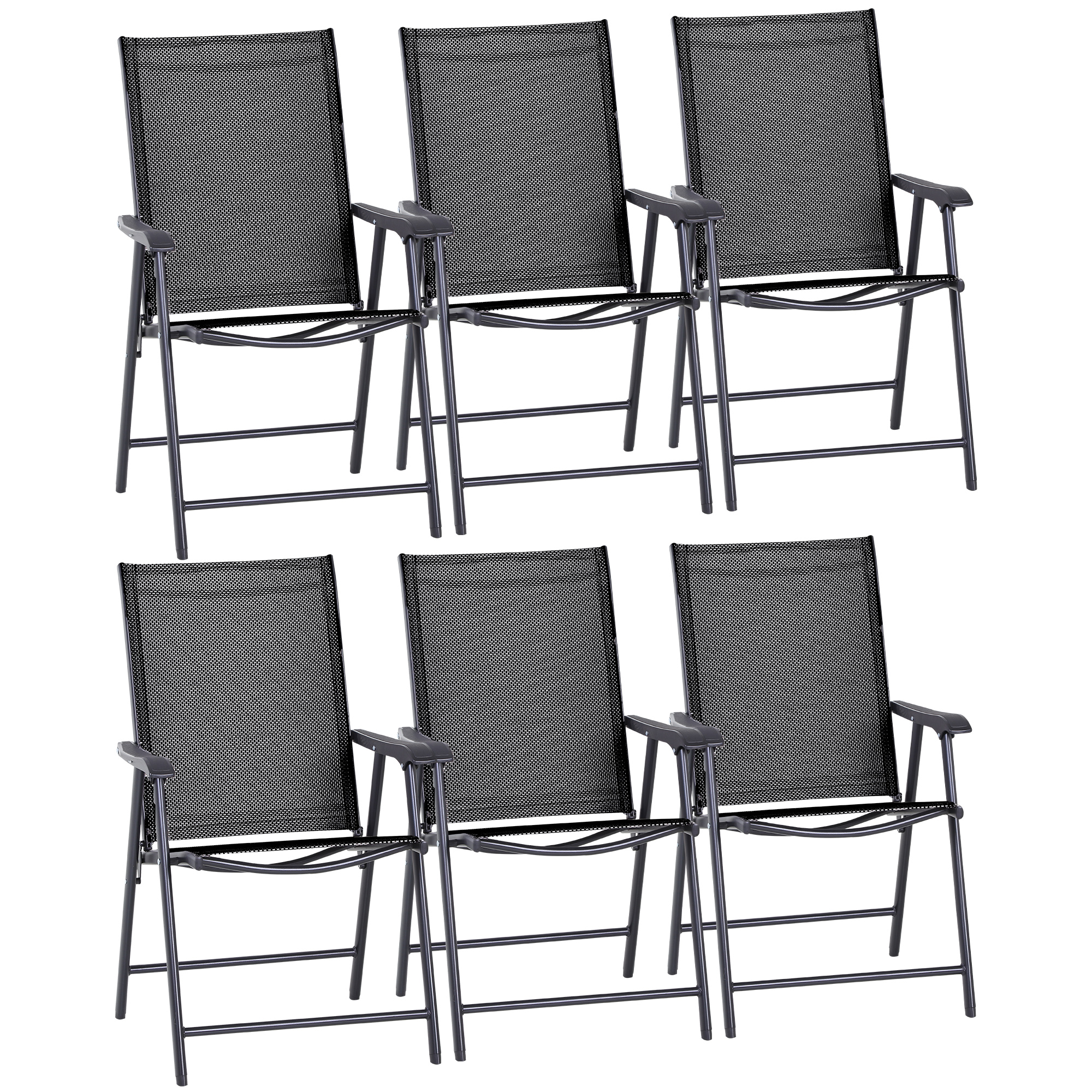 Never be stuck for a seat again, whether you're home or away, with this set of six Outsunny folding chairs. Using metal with a powder coating for extra strength and durability, both frames are fitted with texteline panels for your skin to breathe - great for the hotter days. With a tall, slightly tilted back, wide seat and mid-rise armrests, all chairs will support you properly.