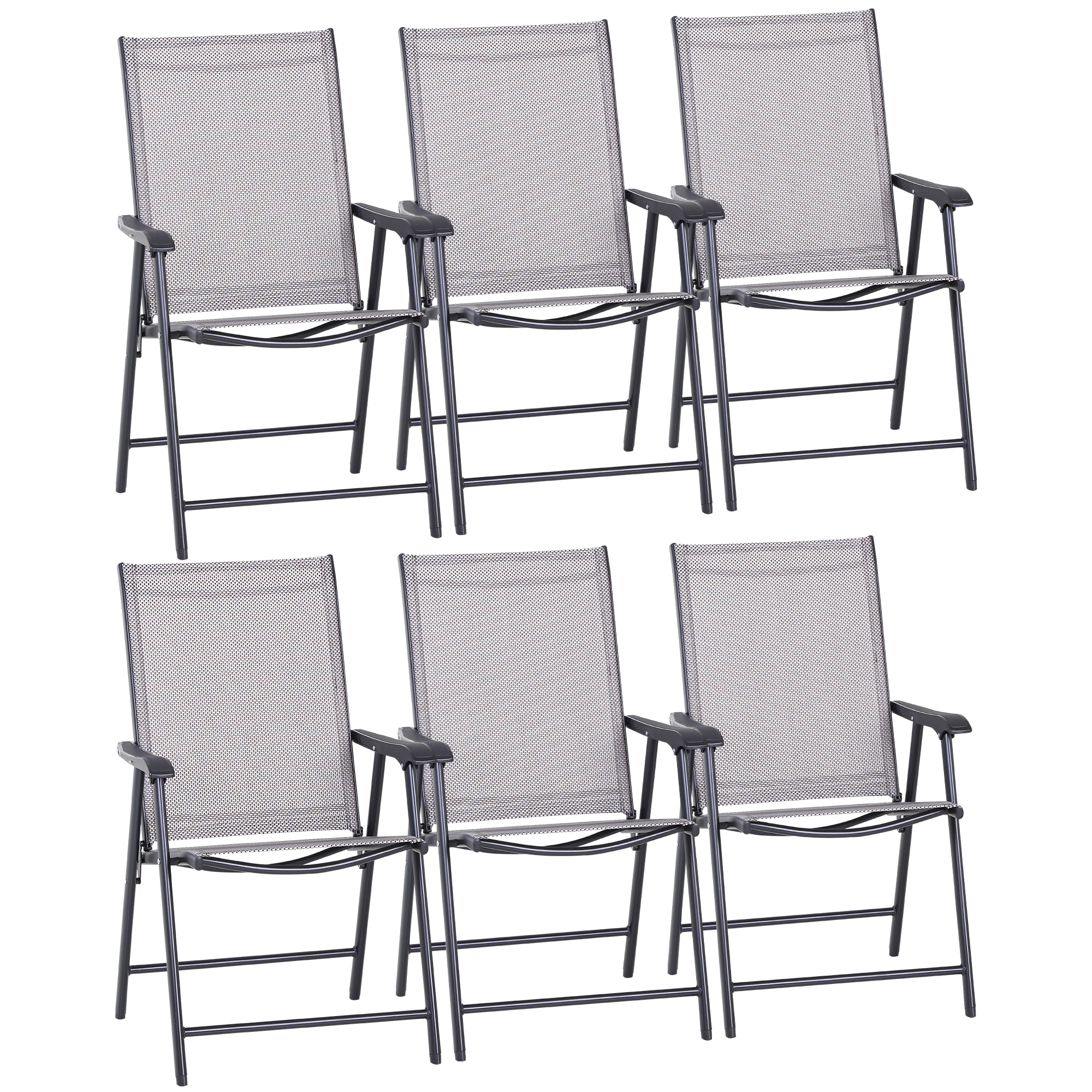 Never be stuck for a seat again, whether you're home or away, with this set of six Outsunny folding chairs. Using metal with a powder coating for extra strength and durability, both frames are fitted with texteline panels for your skin to breathe - great for the hotter days. With a tall, slightly tilted back, wide seat and mid-rise armrests, all chairs will support you properly.