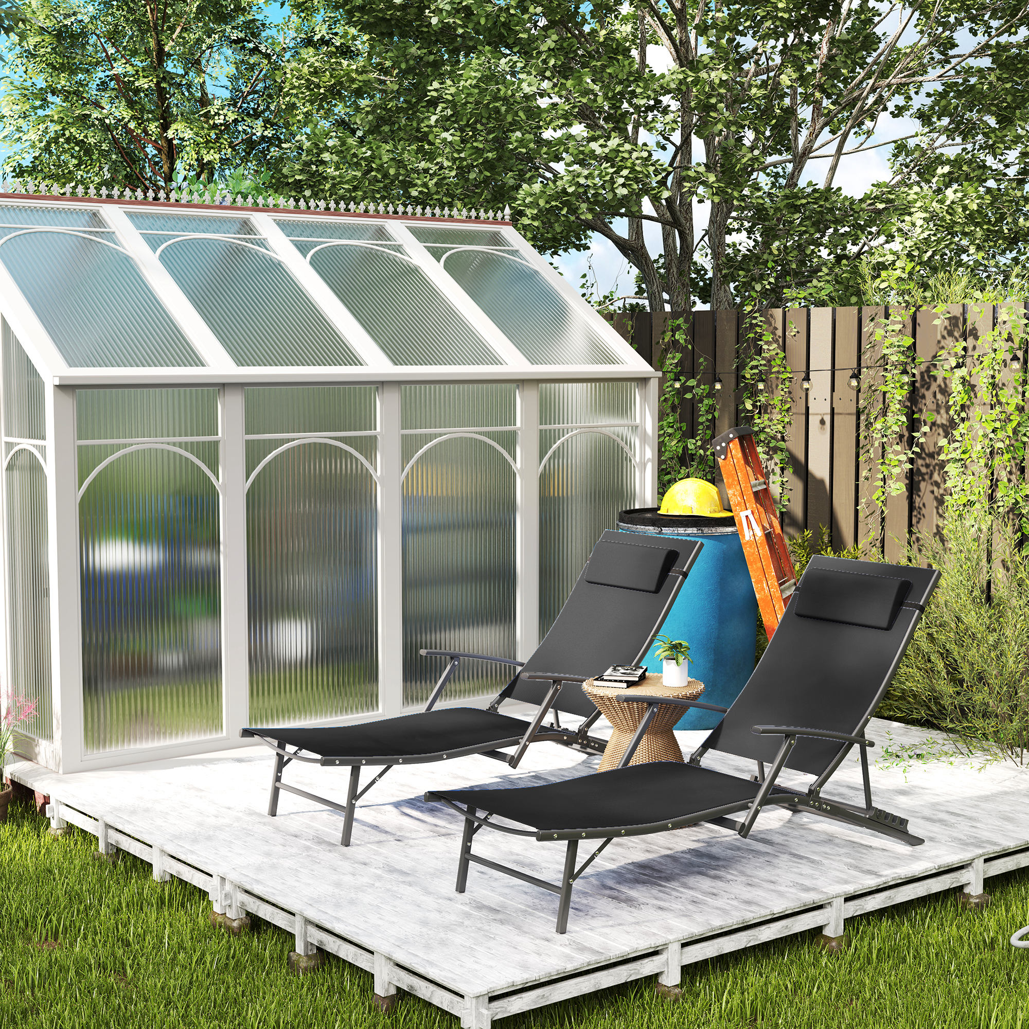Soak up the sunshine, how you want with these two Outsunny sun loungers. They have a four-level adjustable back, so you lie back to a position of your choice. The quick-dry texteline mesh seats hold you comfortably, with top pillows to prop the head and neck. With powder coated steel frames for a strong core, they can be folded to carry around and store easily.