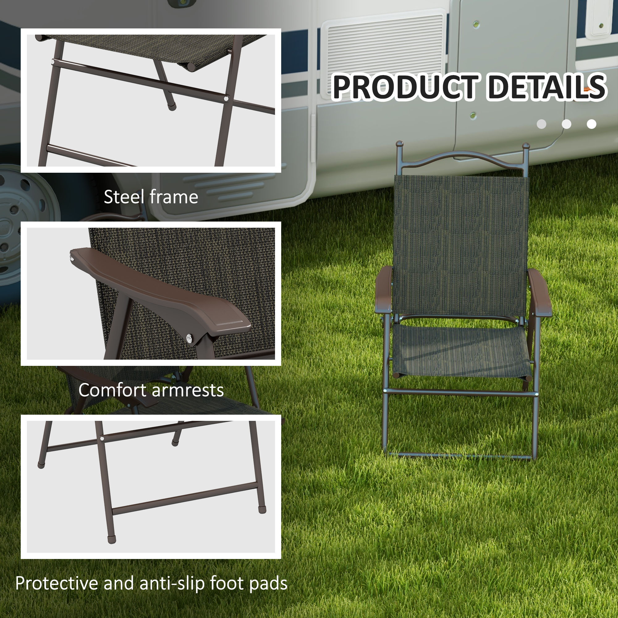 A comfortable seat for outside anywhere. These Outsunny folding chairs are portable designs, so you can take them to many places. Powder coated steel frames are strong and supportive. Tall back and armrests to support your body. Mesh fabric seats keep you comfortable. Two chairs per set.