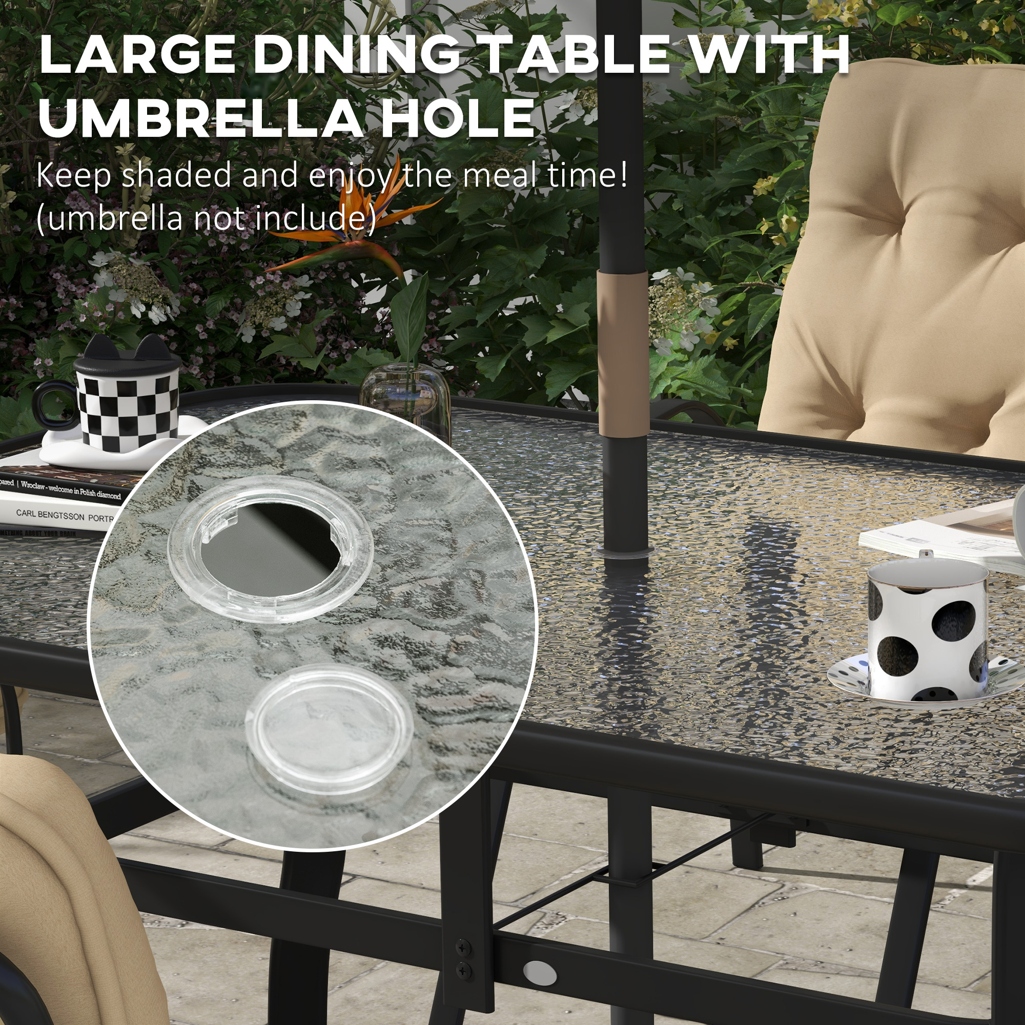 Enjoy your socialising time outdoors comfortably - look to this garden table and chairs set from Outsunny. Comes with six padded armchairs and a tempered glass-top table. Steel frames make each piece strong. High backs and armrests on the chairs for support, with a padded seat for comfort. The table is fitted with a tempered glass tabletop - comes with a middle hole to hold a parasol umbrella in place (Ф38 mm sized pole).
