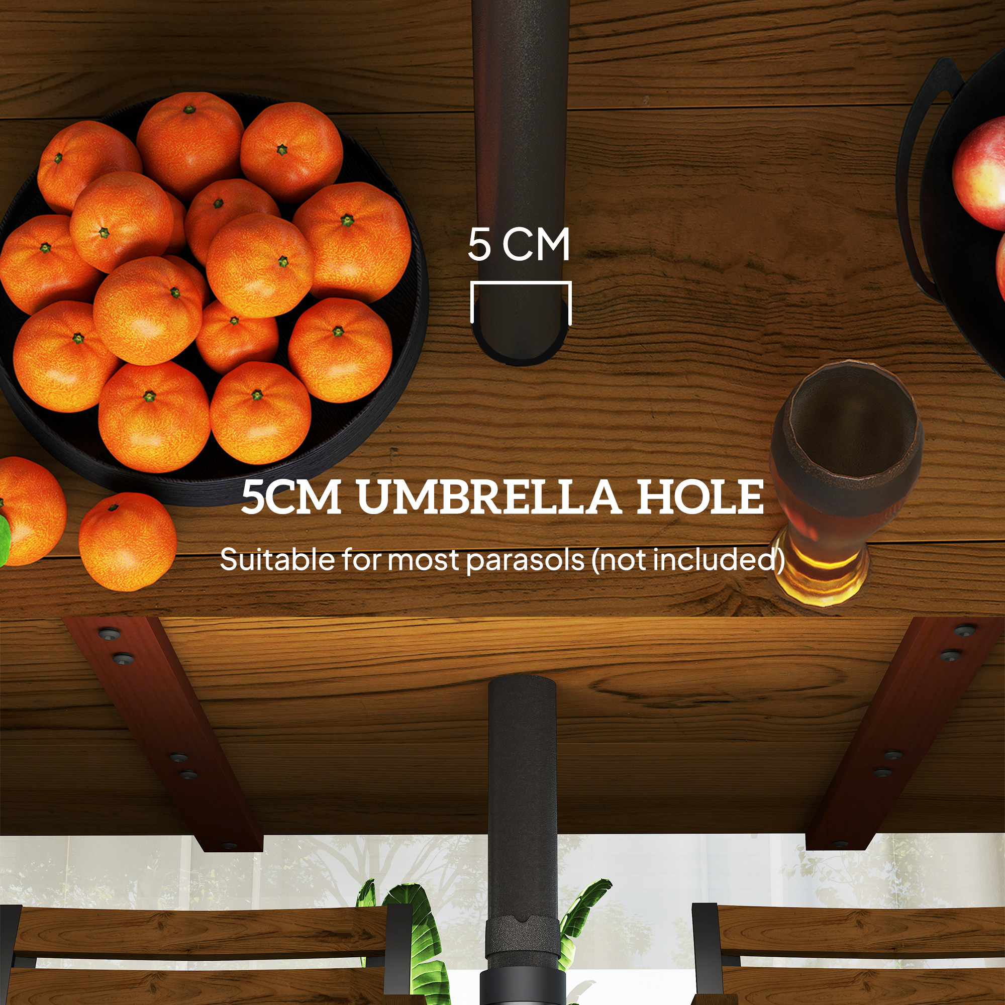 Style, bringing everyone together outdoors, with this Outsunny seven-piece dining set. With a large dining table and six stacking chairs, there's enough room for friends and family. Powder coated steel frames mean a strong core, fitted with fir wood panels for a natural and beautiful touch. With the ⌀5 cm parasol hole in the table, you'll keep safely shaded with the garden umbrella of your choice.