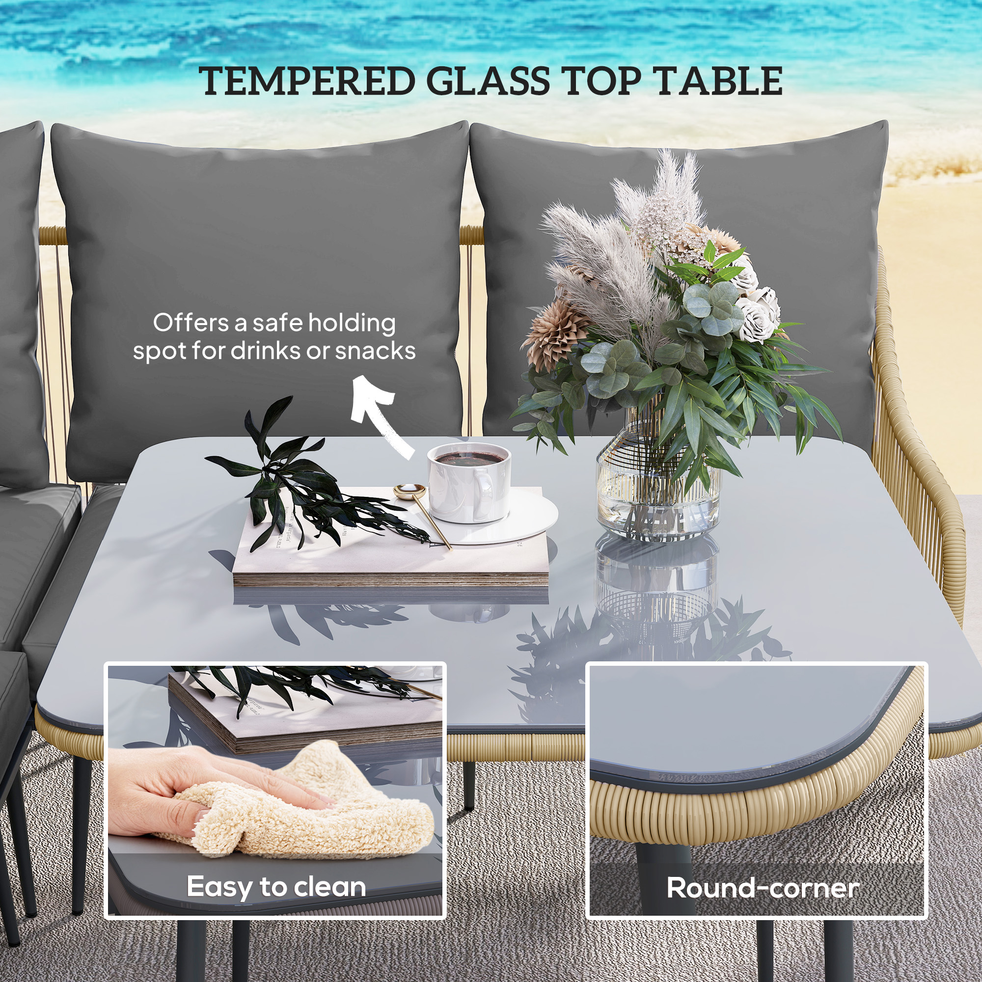 Simple and sleek, finished with total comfort - this Outsunny garden sofa set ticks all the right boxes. The outdoor furniture set comes with six pieces: two loveseats, a corner chair, two footstools and a square table. Steel frames mean a strong core, with the rattan string panels adding a delicate style. The thickened padded cushions on the seats and back of this garden lounge set allow you to relax comfortably. The glass tabletop adds a sleek finishing touch.