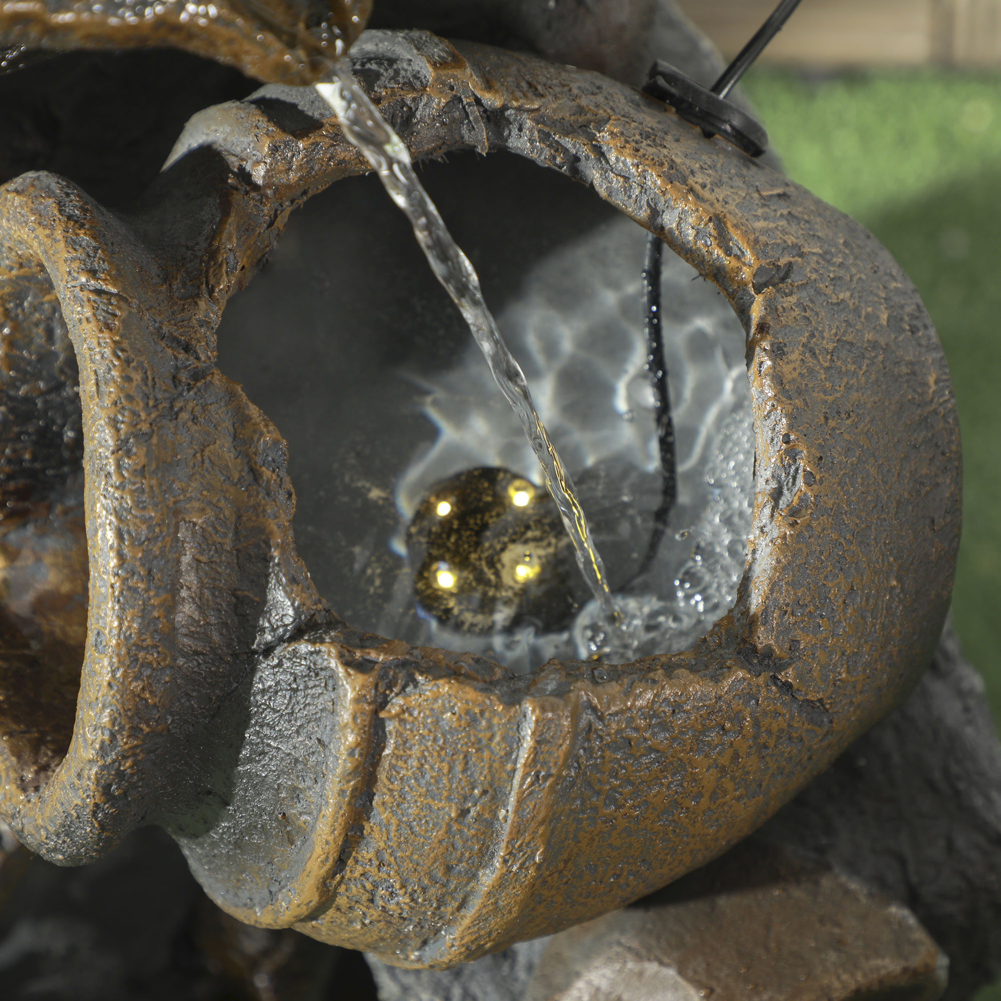 Enhance your garden with this 4-tier garden water fountain, a great choice for decoration. Its realistic look is well-suited for rustic or Zen gardens. The included pump guarantees an independent water circulation, maintaining a constant flow of gurgling water. Additionally, the waterfall fountain features LED lights at 3 levels, illuminating the trickling water and creating a captivating atmosphere. Add natural beauty to your space by using the cascading broken jars and natural stacked stones.