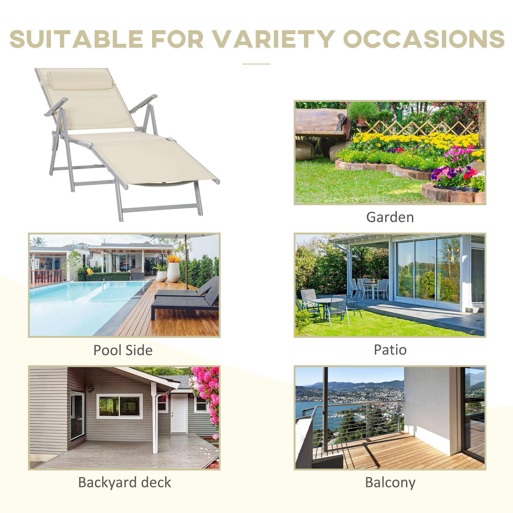 Relax easily all day long - thanks to this Outsunny garden lounger. The seven-level adjustable back means you can rest back to a position you want: whether shutting eye, reading a book or catching up with a friend. The metal frame is strong, with three long base legs for balance, wrapped in fabric to hold your body with full support. The removable top pillow keeps your head comfortable. When you've finished using it, this garden sun lounger is easy to fold up, carry and store.
