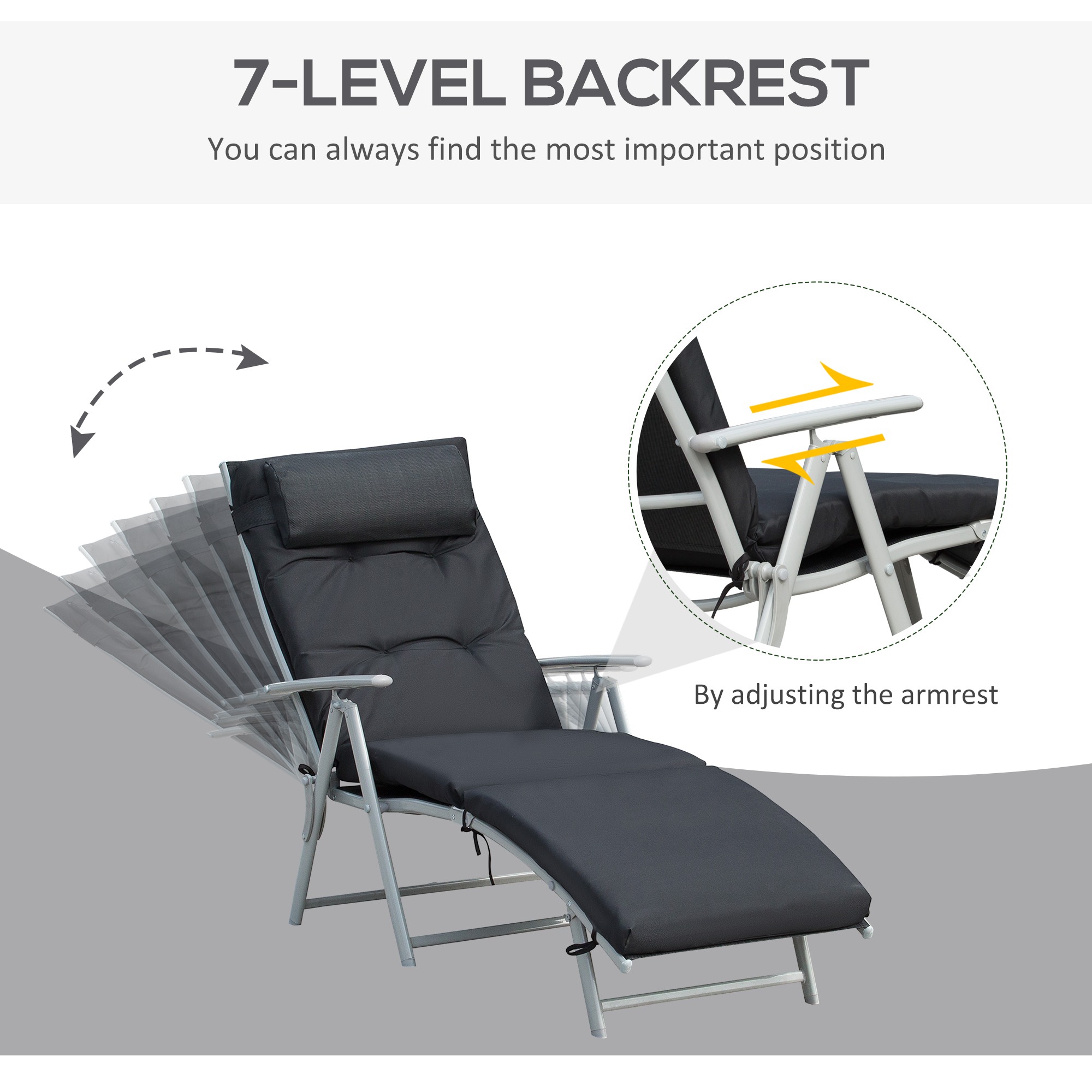 Bring classic comfort to your garden with this sun lounger from Outsunny. Using sturdy and thick steel to form the frame, it is able to handle up to 160kg effortlessly, with its design featuring a seven-level adjustable back for in-control support, a thick, removable cushion seat for all-day comfort and a detachable pillow to give your head a spot to lean back on. Foldable in design, you can move and store this lounger very easily, making it just as convenient as it is functional. A great way to spend your day soaking up the sun.