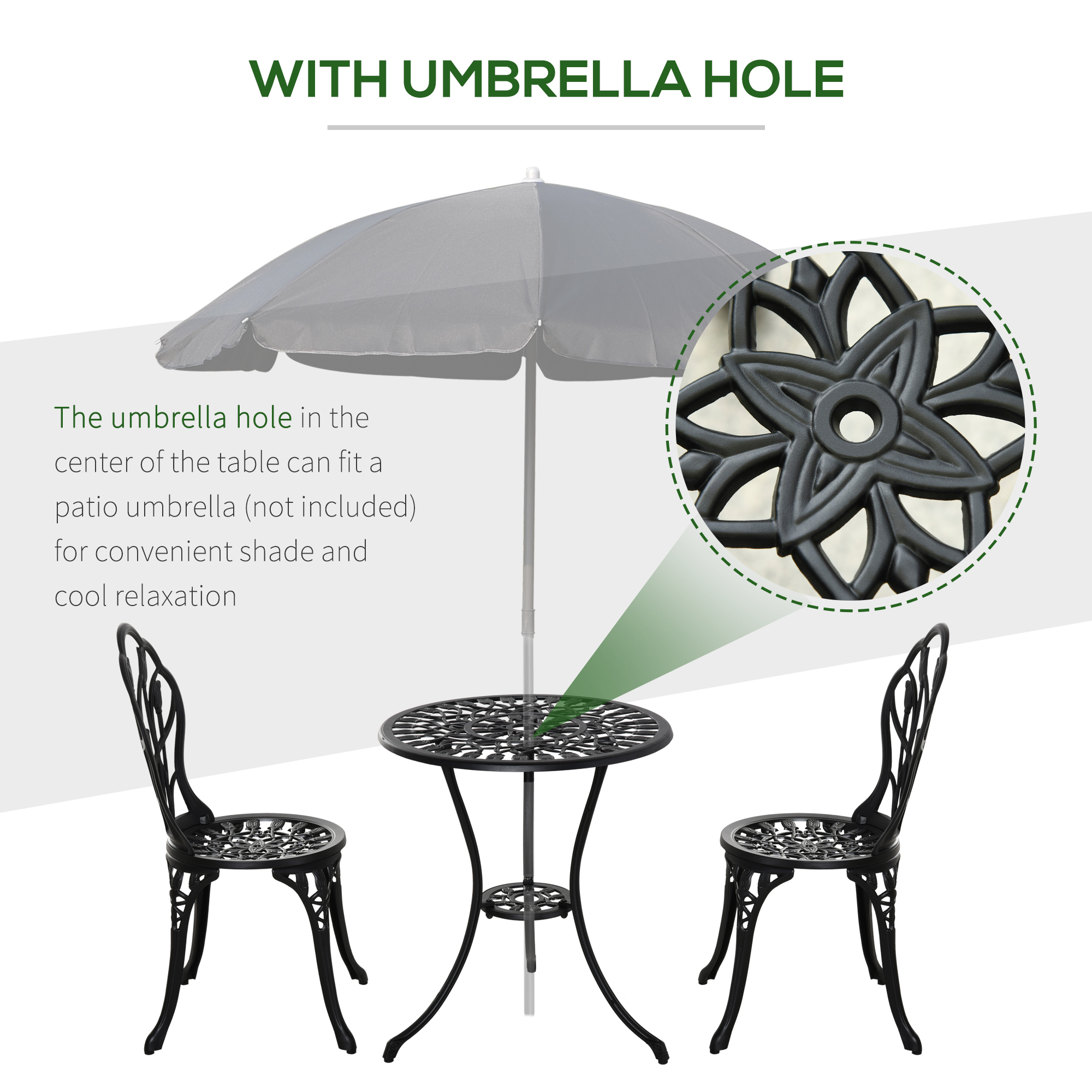 Enjoy outdoor times with some vintage charm, with this Outsunny three-piece bistro set. The hollow-carved tulips design is beautiful. Made from cast aluminium for long-term use. The table of this garden set features an umbrella hole, so you can all keep shaded from a parasol safely when it's sunny.