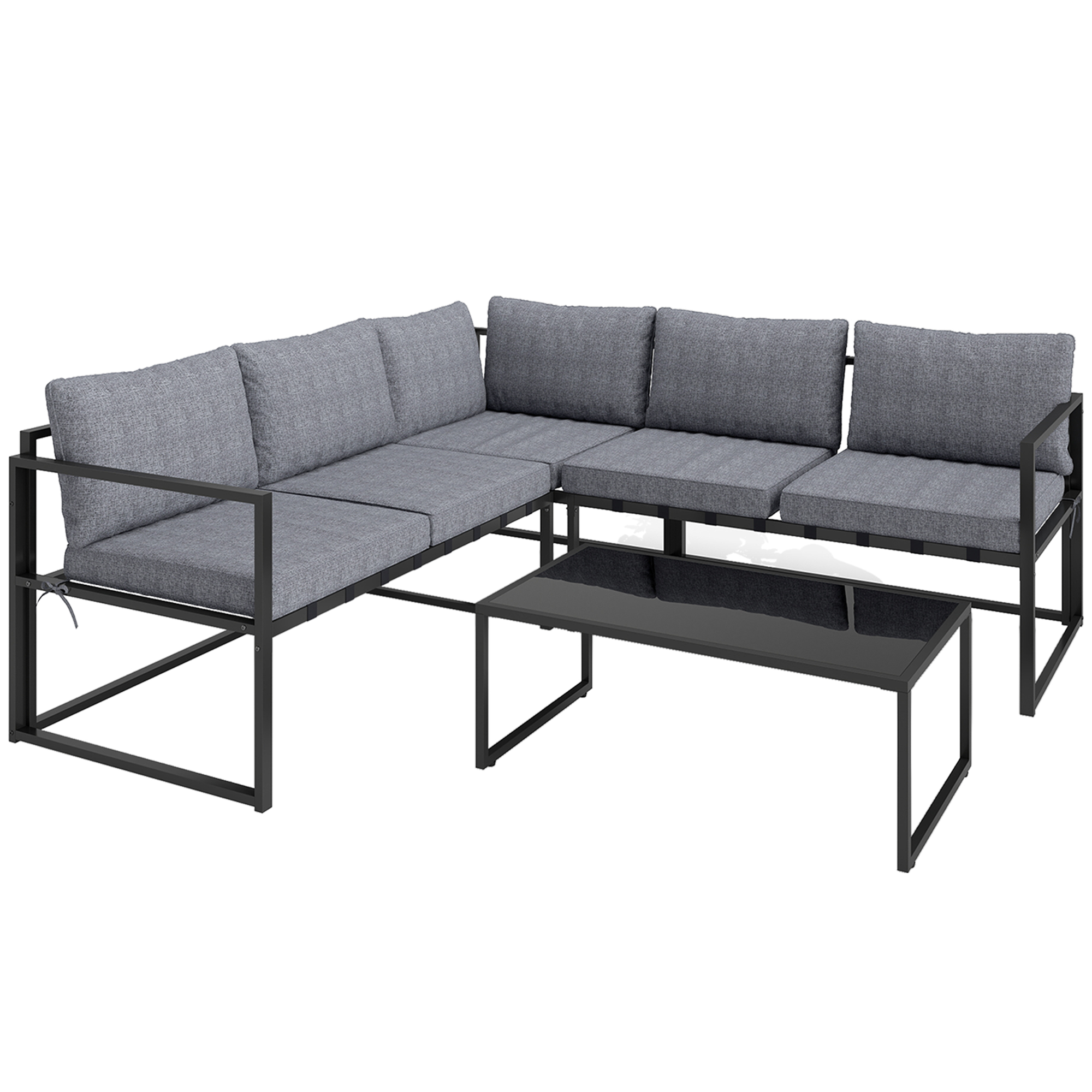 Discover the charm of the Outsunny corner garden furniture set, a delightful addition to any outdoor space. This three-piece set includes a three-seater sofa, a loveseat and a coffee table, topped with sleek black tempered glass. Enjoy optimal comfort with thick, soft cushions and a robust, weather-resistant steel frame. Great for lounging under the sky or hosting memorable gatherings. Suitable for any garden, balcony, or patio.