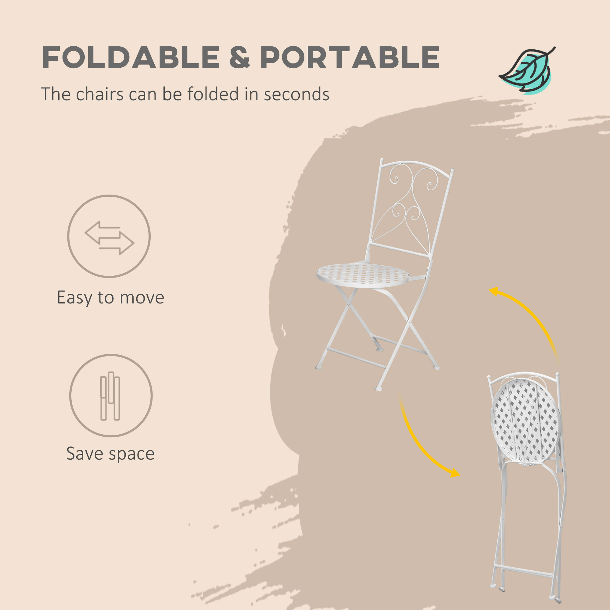 This Outsunny outdoor bistro set is ready for the seasons ahead. It includes a round side table with engraved scrolled, with pairs with the scrolling on the chair backs - pretty and elegant. All pieces are made from metal, so they're strong and tough and will support you when being used. Both the chairs and table are foldable - so when you're done, you can carry and store them easily. A great way to enjoy the sunshine with company.