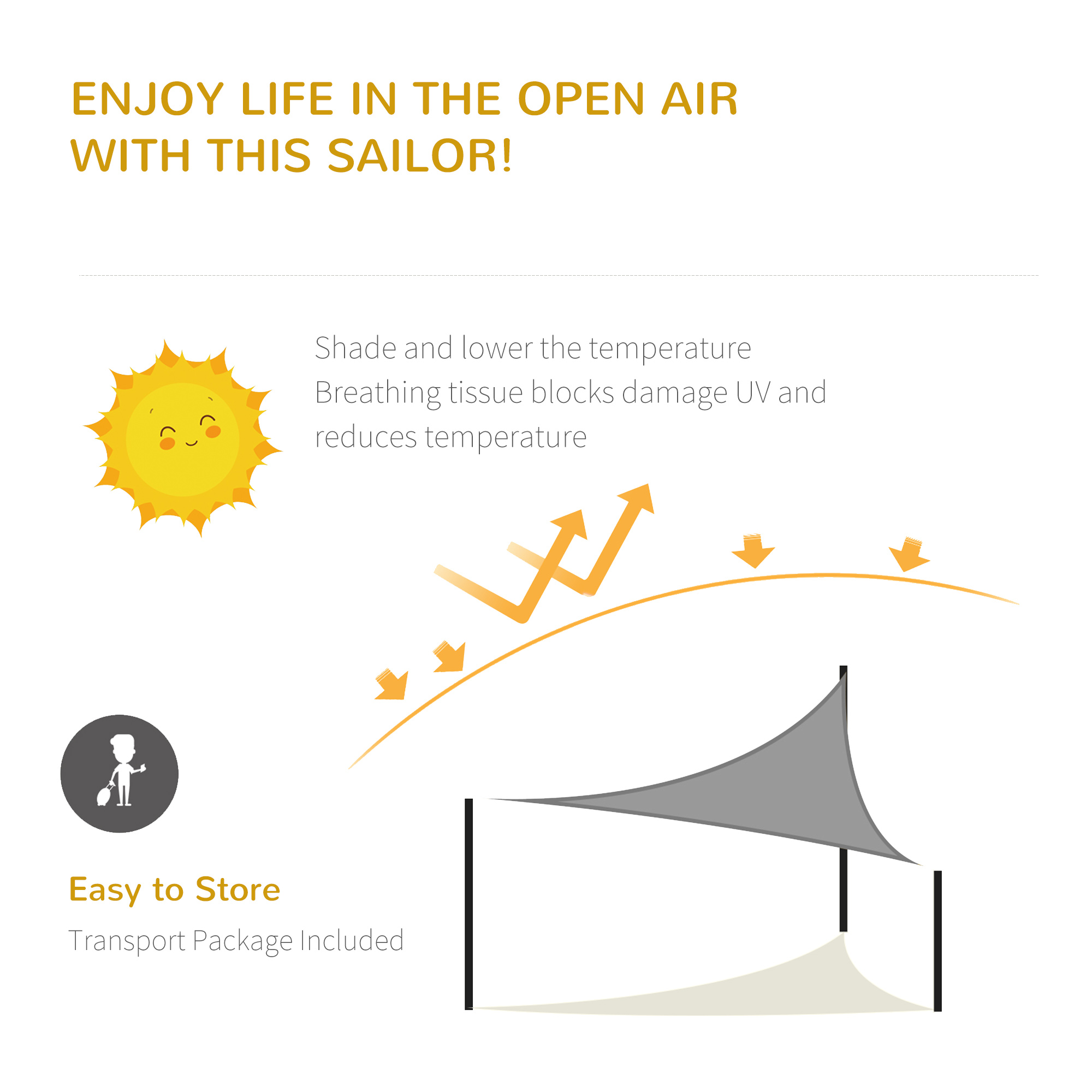 Keep sheltered outdoors with this sail shade from Outsunny. Made from 185gsm polyethylene, our sail shades for garden are tough and protects you from direct sunlight and damaging UV rays - meaning you can sit safely underneath. Cut to a triangle shape, this sun sail is easy to attach to odd-shaped spots, with stainless steel rings on each corner and ropes to secure into place. Now any spot will become the go-to place when the sun comes out to play. Carry bag included.