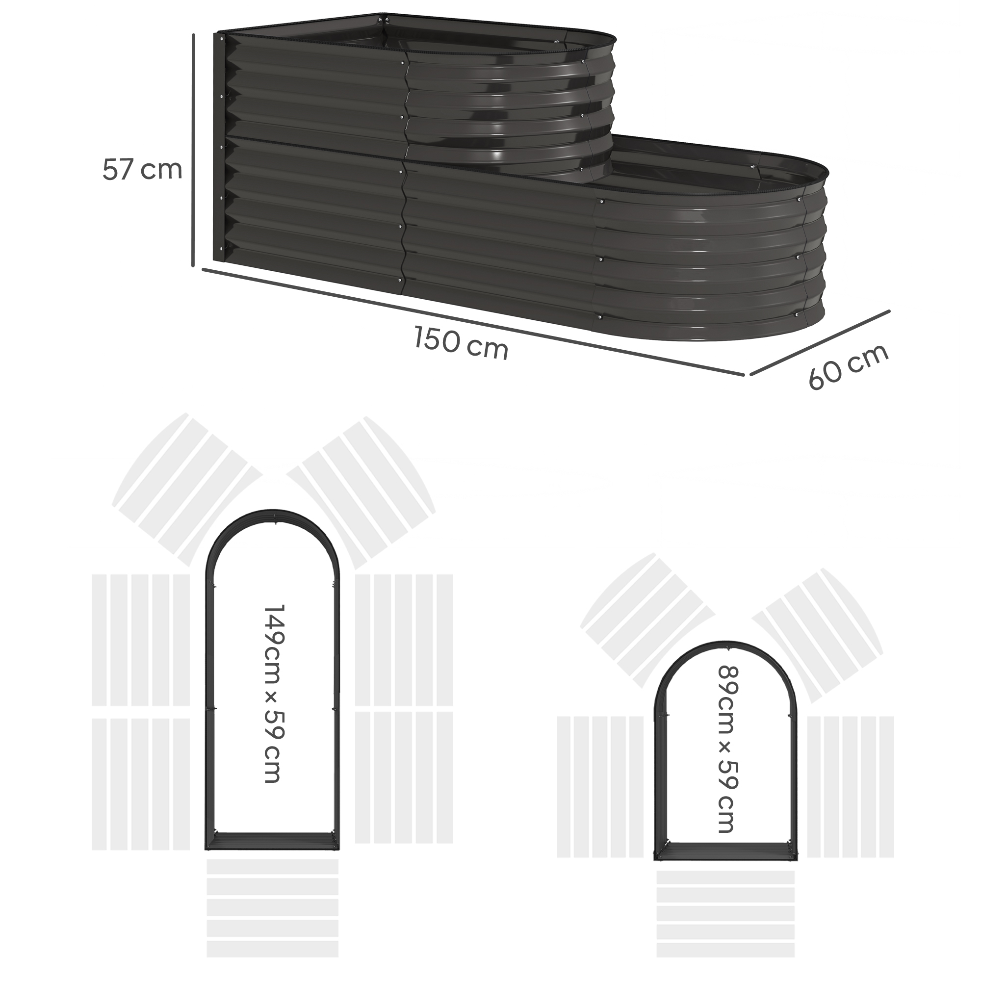 - Planting Area Size: 149L x 59Wcm (bottom), 89L x 59W (top)