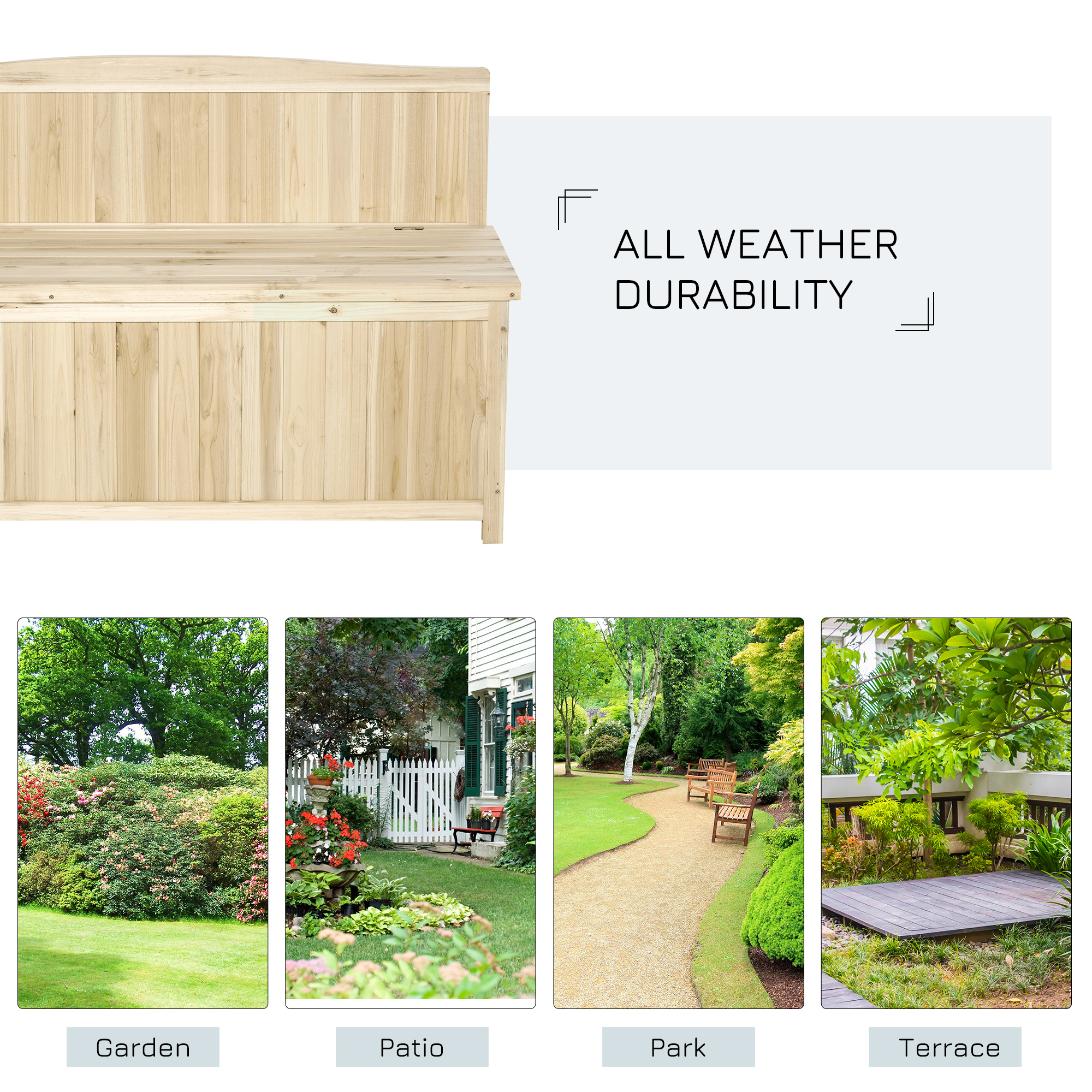 This Outsunny garden storage bench gives you a place to relax and space for keeping your outdoor essentials stored. The varnished surface protects the fir wood structure against weathering so the park bench lasts longer outdoors. The ergonomic shape of the bench allows you to sit comfortably, with its maximum 250kg bearing weight allowing wooden bench to hold up to two people. No garden is complete without this handy garden bench with storage.