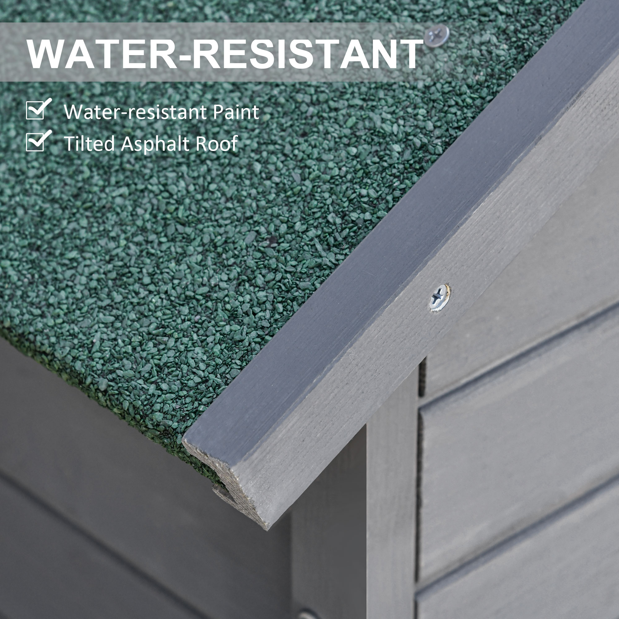 - Sloped roof with asphalt covering to help keep inside dry