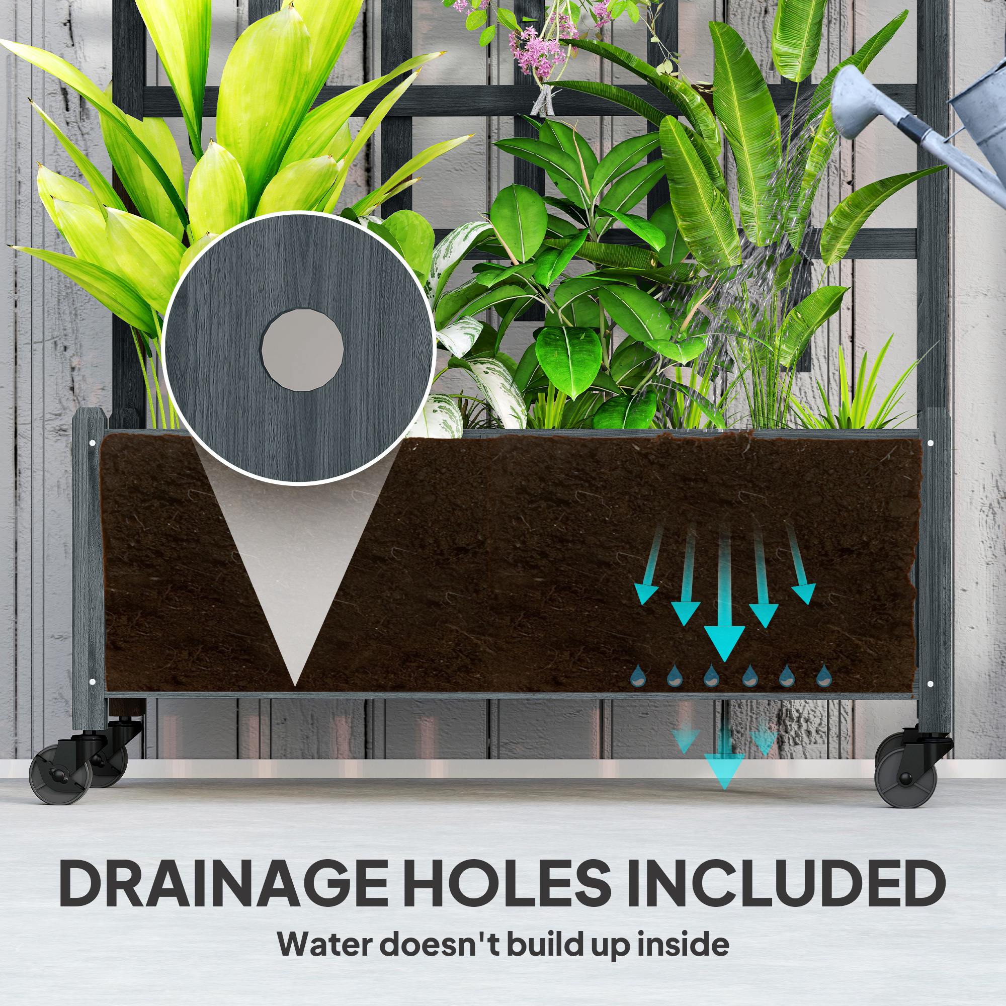 This Outsunny raised garden bed comes with a back trellis - grow plants, flowers, vegetables and let vines and more wrap themselves around the back. Wooden structure makes it strong, with a paint coating for gentle protection. Garden planter comes with the drainage holes to help prevent water build-up, with four wheels for easy moving.