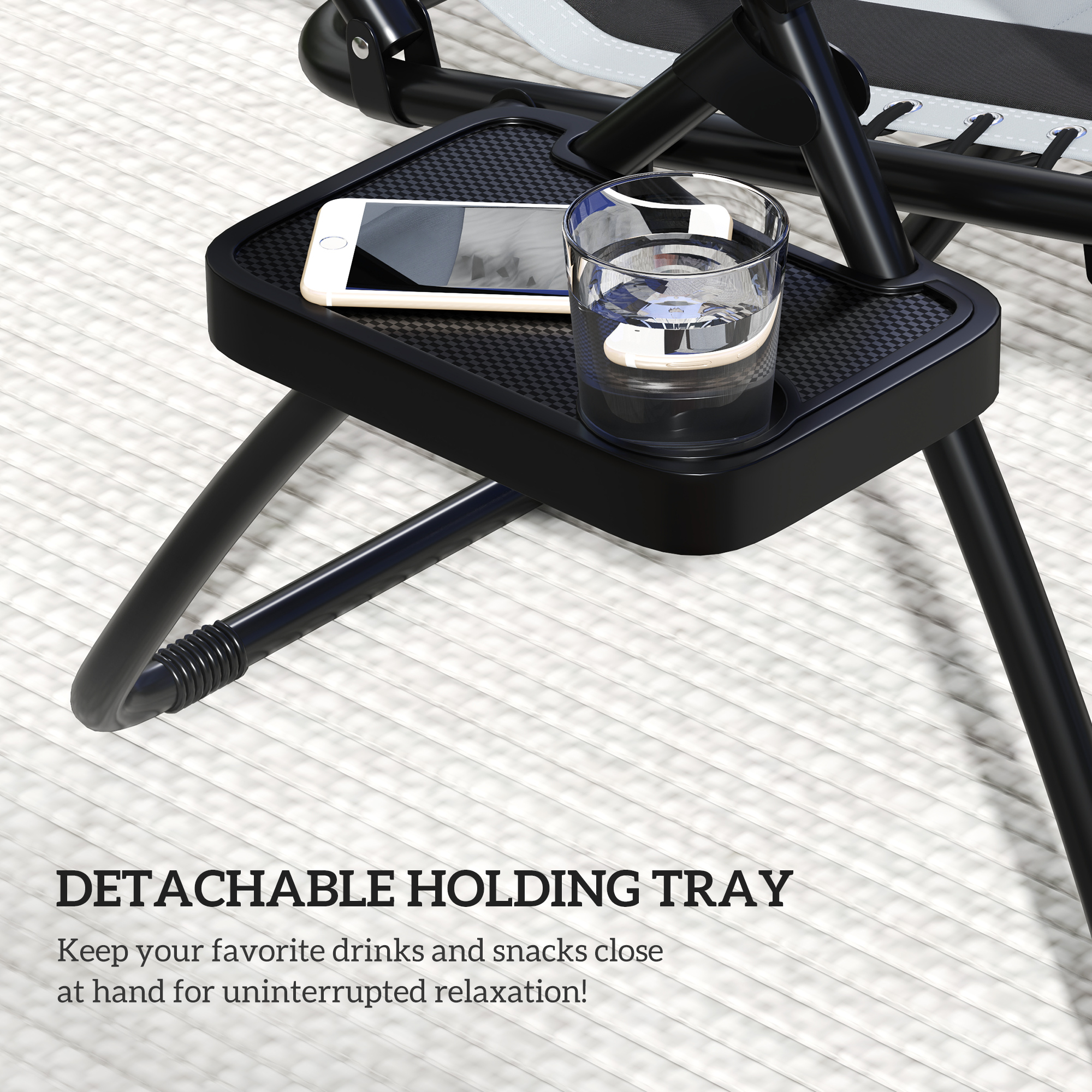 Let the day's stress drift away with this zero-gravity chair set from Outsunny. Its comfortable design evenly distributes your body weight to reduce back pressure and provides superior lumbar support as you sit. This piece of outdoor furniture allows you to relax while fully reclined to the most comfortable 'zero-gravity' position.