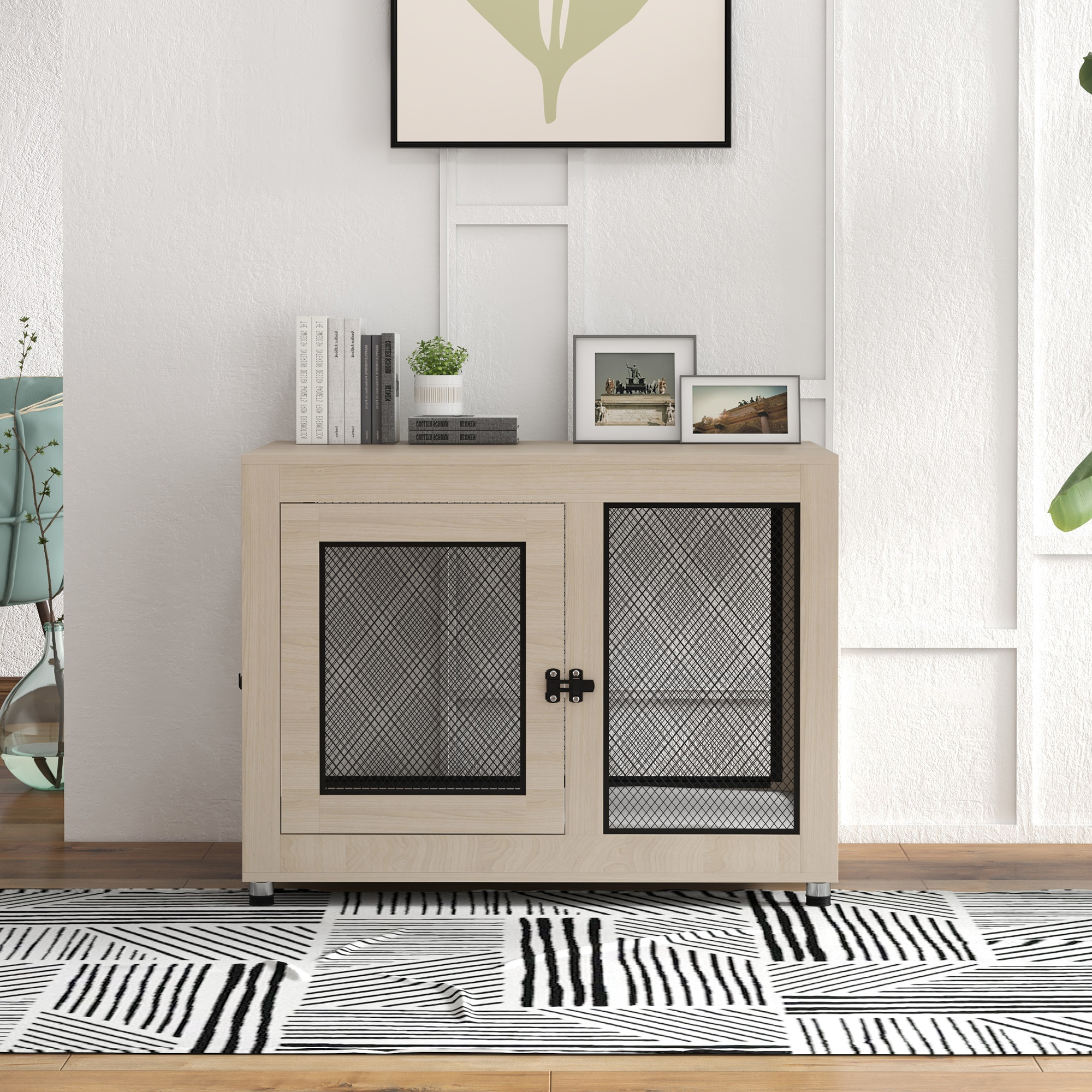 A PawHut dog cage where everyone benefits – pets have a safe and comfortable space to relax, whilst you have a stylish table-top to display your favourite pieces. Pets will enter through the front or side door, where they'll lay on the soft, washable cushion, whilst the steel wire lets air flow through to keep them cool – the lockable doors ensure they're secure. A particle board structure, this durable cage has four adjustable feet, keeping it solid and stable; a piece for all to enjoy.
