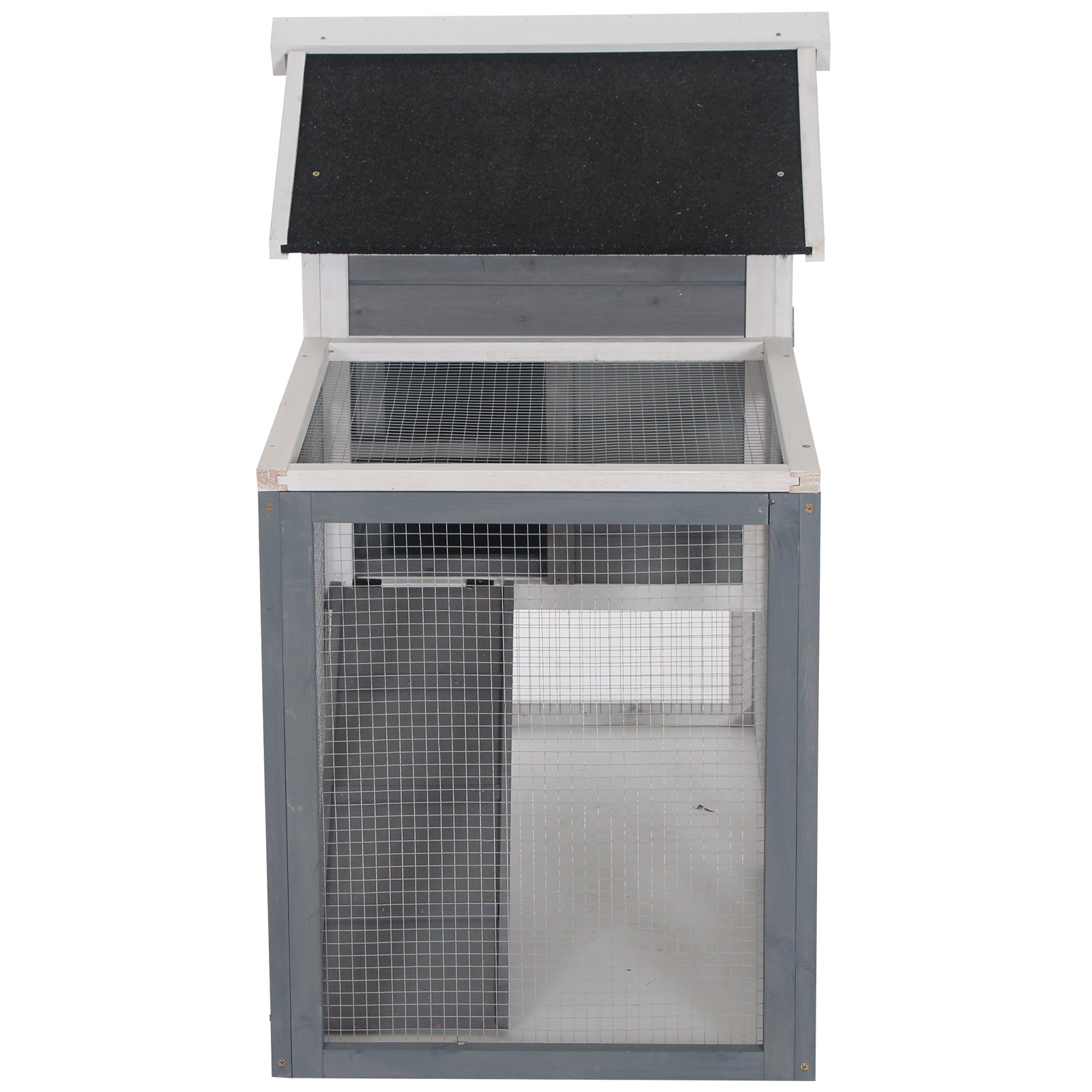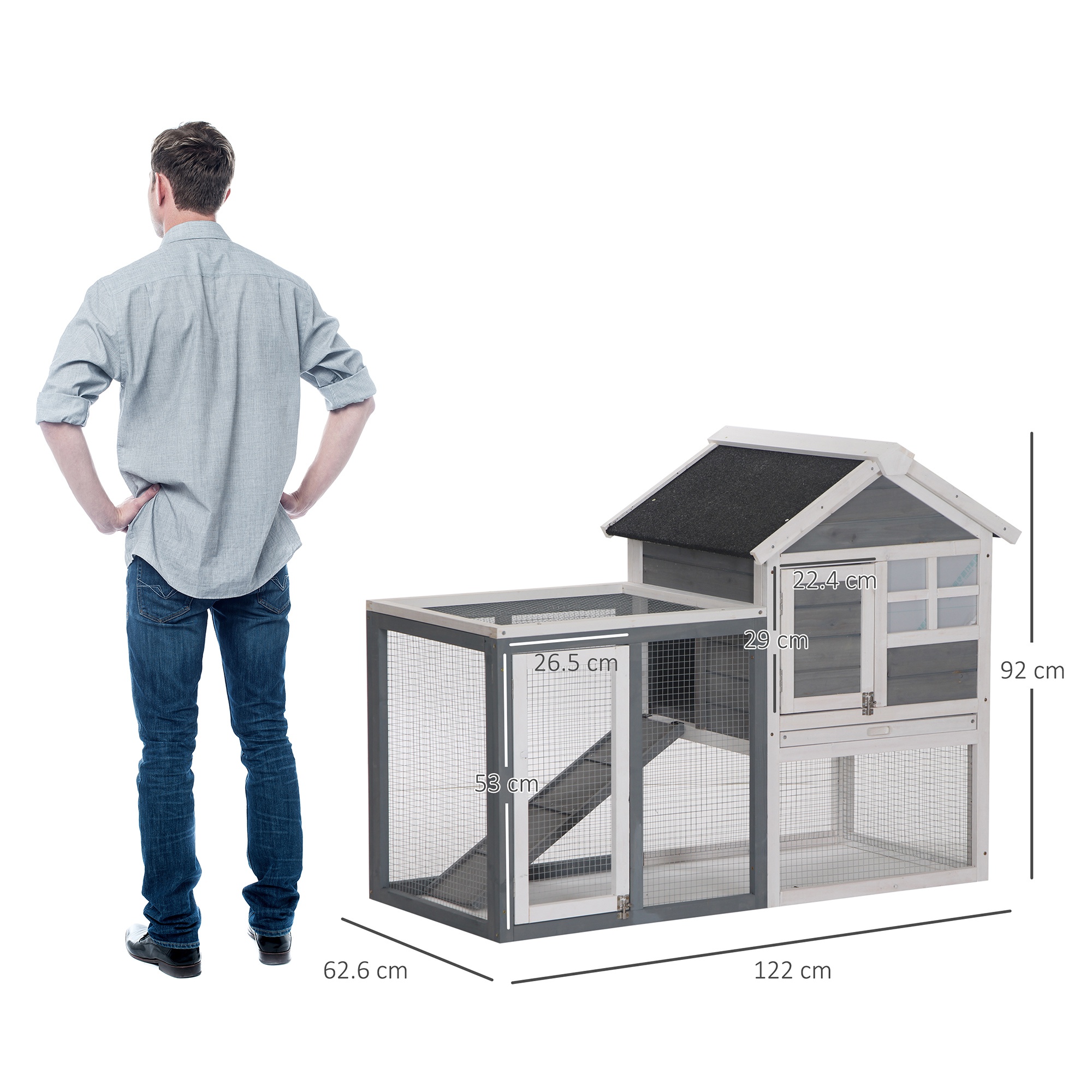 This outdoor rabbit cage from PawHut is perfect for use with rabbits, guinea pigs, and other small animals. This great 2-story rabbit playpen features sturdy construction from Fir wood coated with a water-based preservative to ensure long-lasting use whether used indoors or outside in the elements. This rabbit starter kit hutch has a sturdy steel wire outdoor run for your pets to run around as well as an enclosed space for them to be able to sleep indoors. The outdoor run area accessible by a ramp so your pet can enjoy the outdoors while still being protected from the elements and predators. There are 2 easy to open doors to gain quick access to your pets, one is able to open up the outer run area and the other is to open the inner loft area. The large main living area has a removable pull-out tray to make cleaning simple and quick.