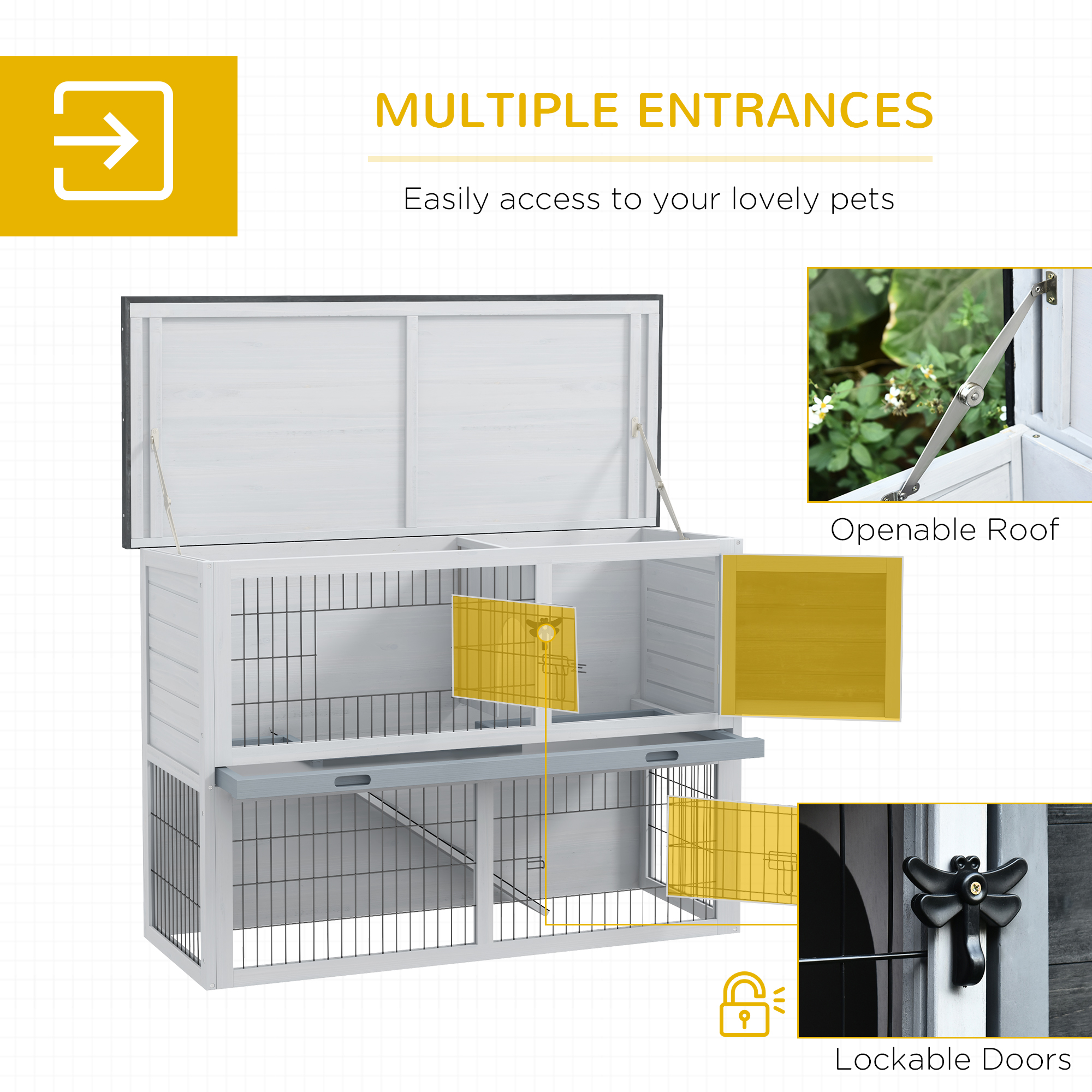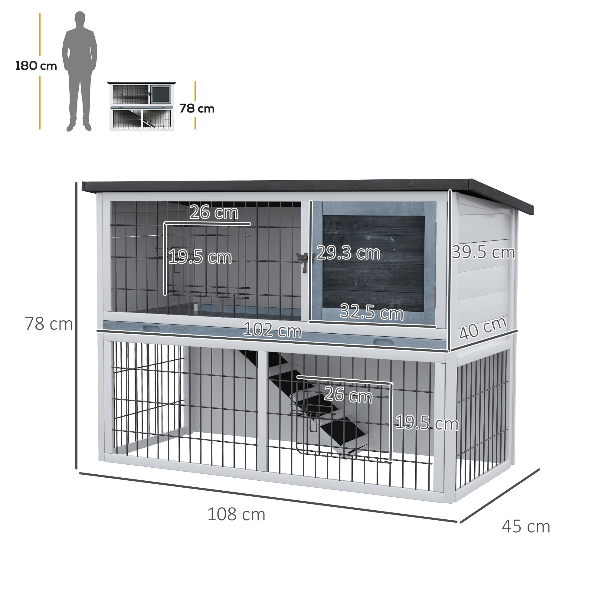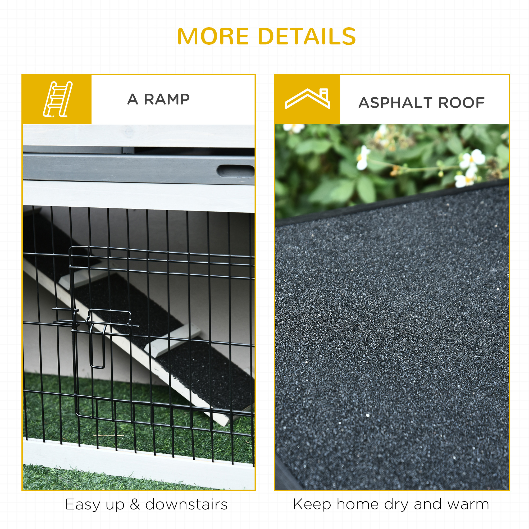 Make pets feel at home with this PawHut rabbit hutch. With two tiers, connected by a ramp, small pets have lots of space to move around. They'll have a private area to rest, whilst the large run area, which is surrounded by steel wire for security, lets them get fresh air. Made with a solid wooden frame with protective paint, it's suitable for outdoors and keeps pets secure when inside. Finished with an openable roof and removable tray for effortless cleaning, so they live in tidiness and comfort.