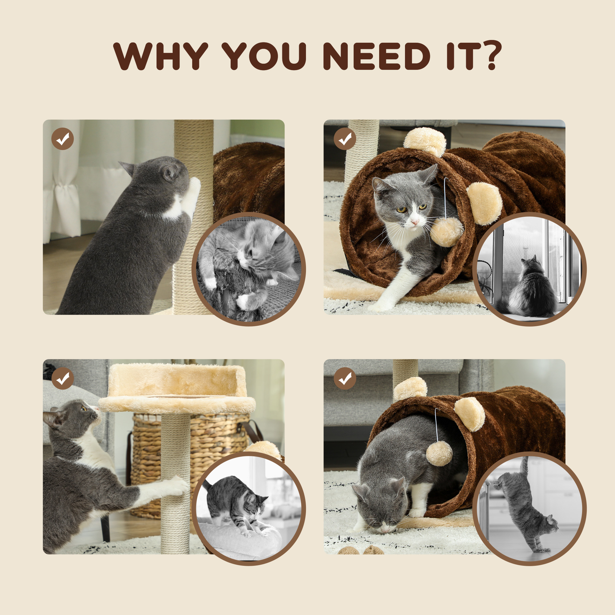Create a cosy cat haven with the PawHut small cat tree. It features a jute scratching post for your cat to dig their claws into and a toy ball for playful swipes. The tunnel, lined with crackling paper, will grab their attention. When it's time to relax, they can curl up on the plush-covered bed, which is slightly raised for a better view. Its stylish, cream and dark brown design, plus its compact size allow it to fit seamlessly into your home, turning any space into a pet paradise.