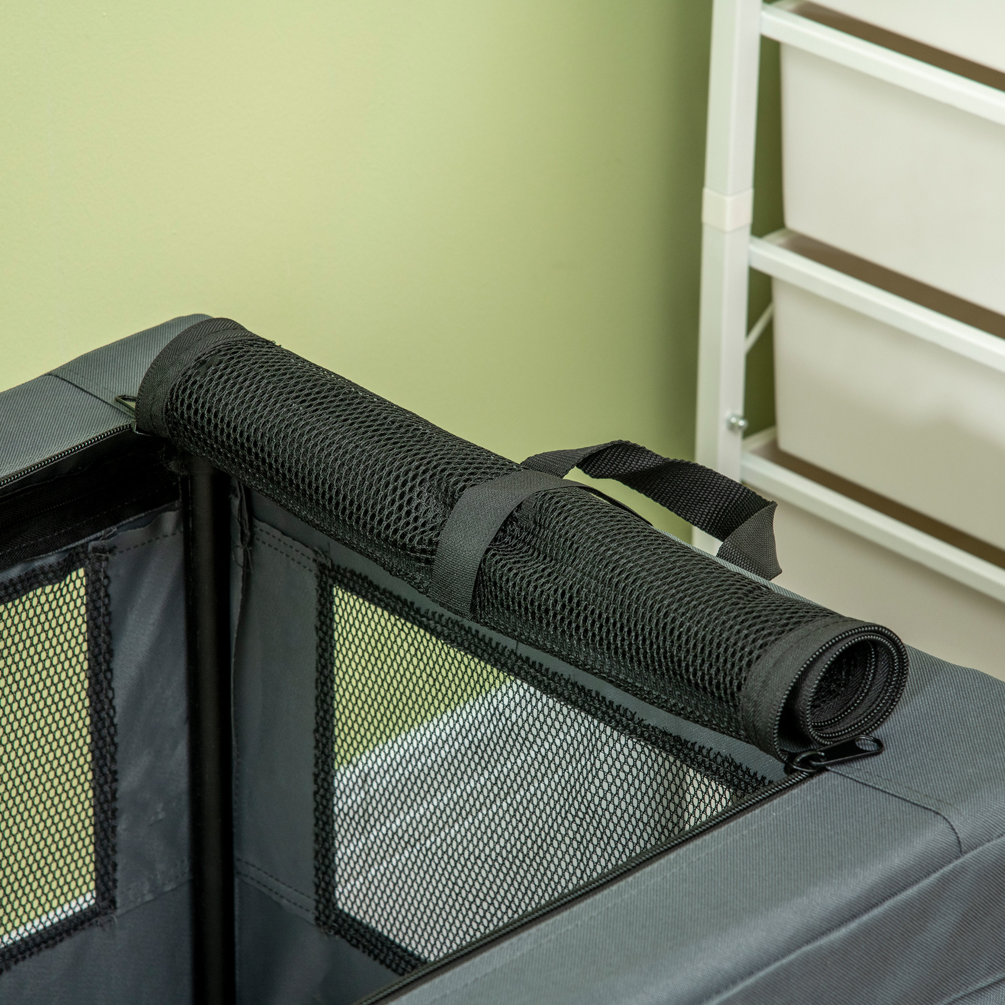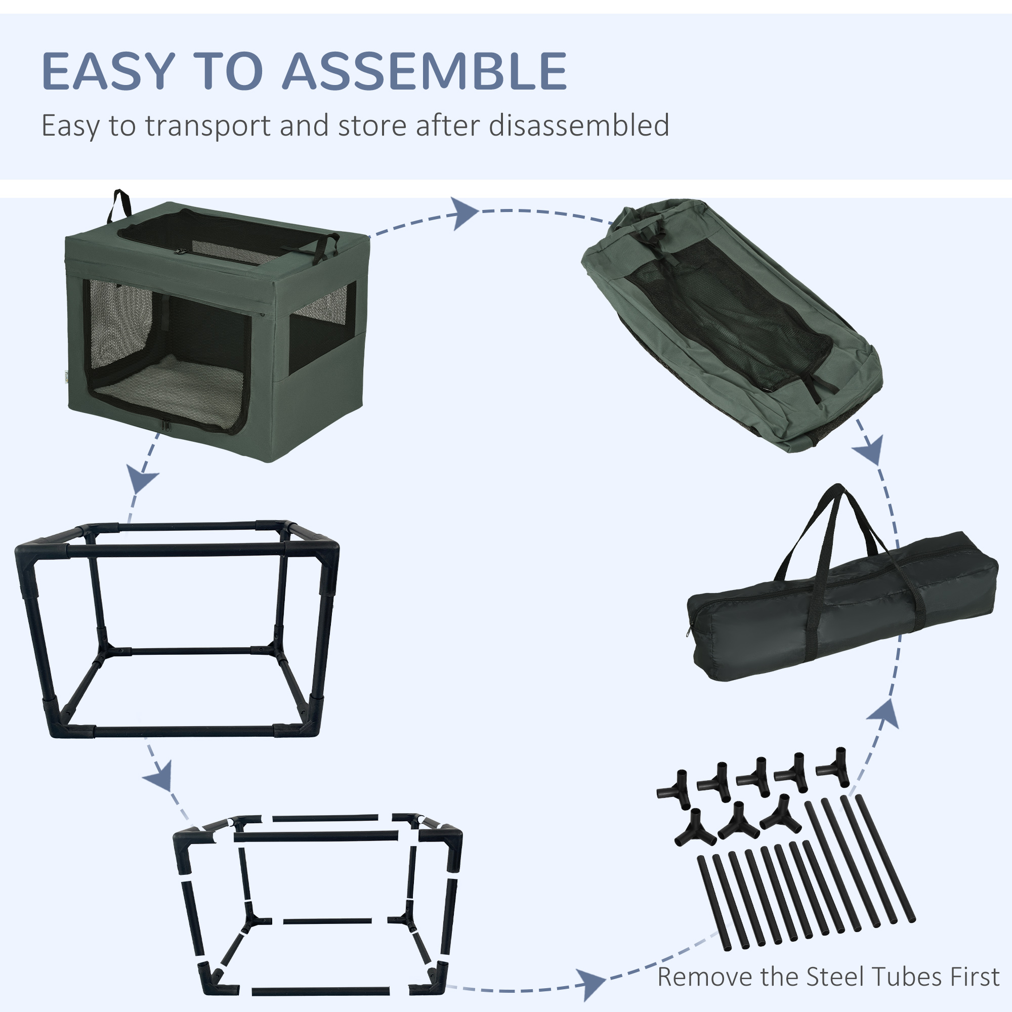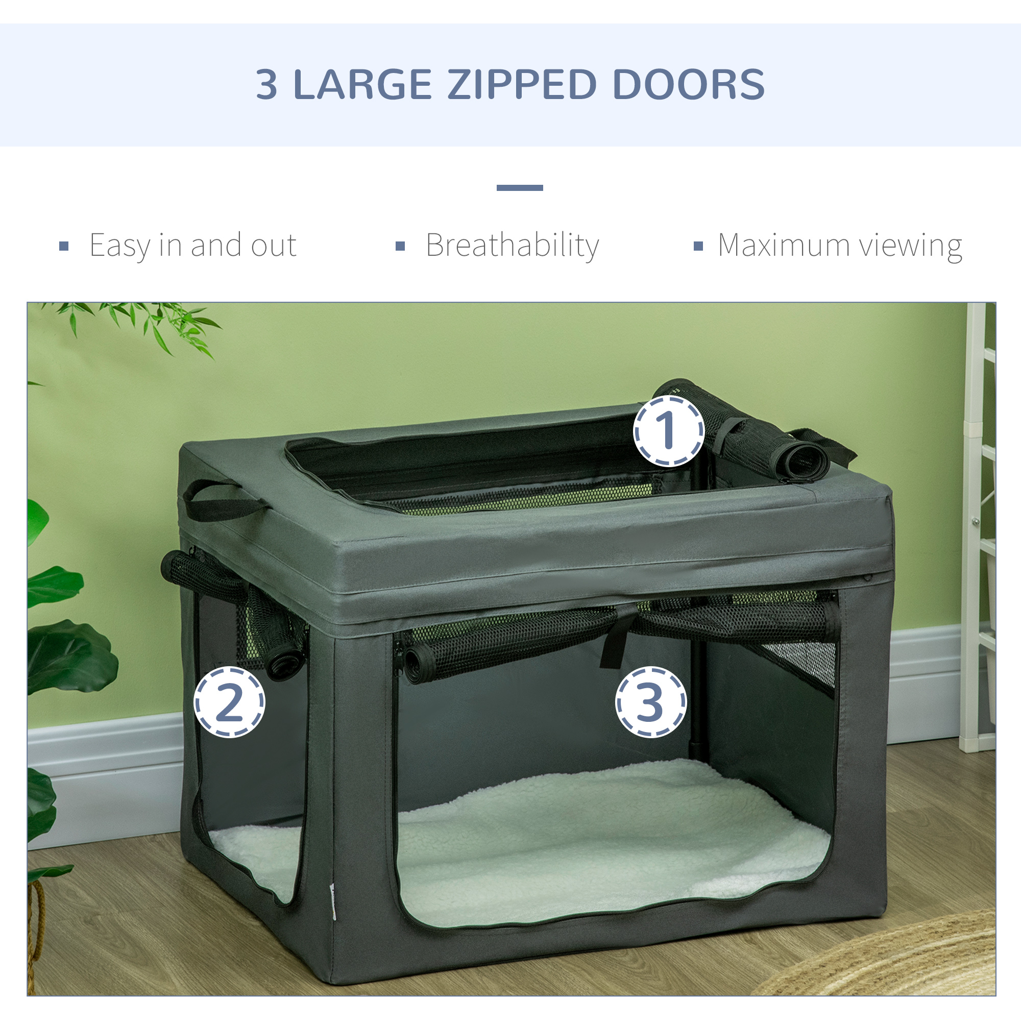 Struggle to travel with pets? With this PawHut fabric dog crate, you'll struggle no more. It has two handles on top, so it's much easier to carry it. Three doors for easy access – they'll enter a spacious area, relaxing on a soft cushion whilst the air flows through the mesh window to keep them cool. It's simple to store with the removable tube frame and comes with a bag, saving space. It can also be used at home, so pets have a cosy lounge.
