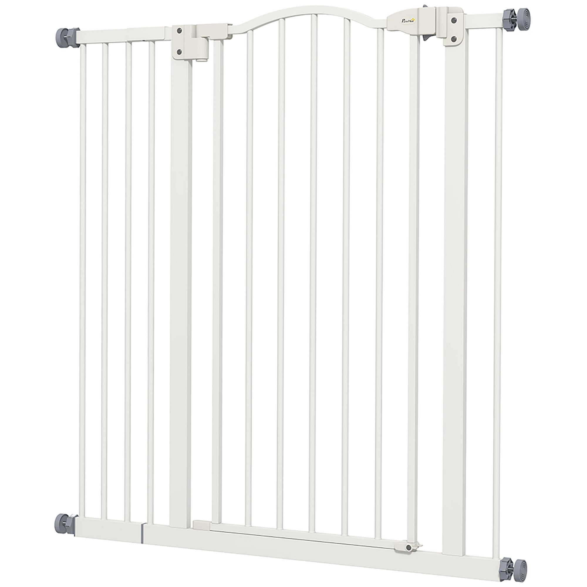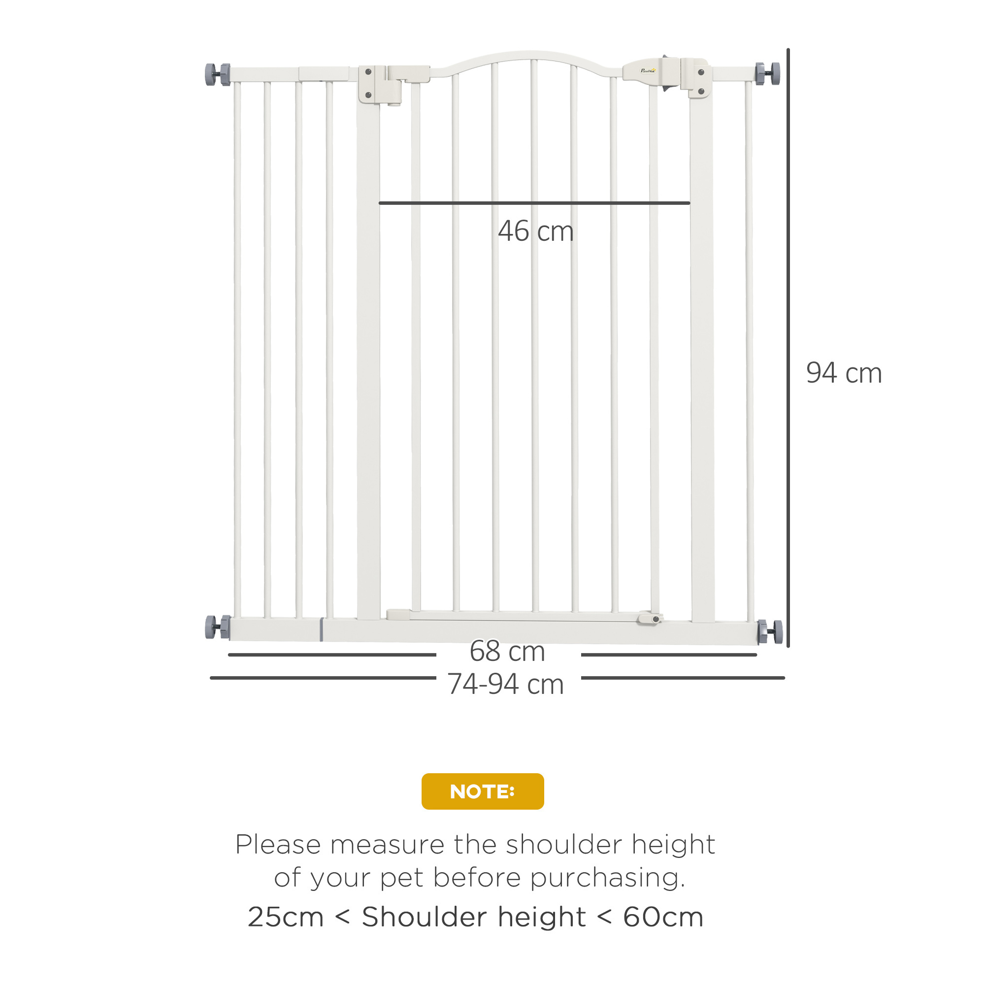 Keep pets away from specific places easily with this safety gate from PawHut. It's made from metal for strength, and its width can be adjusted between 74cm and 94cm, meaning it will fit properly in door frames and other passages. Fitted with a middle door to pass when needed, the slide-and-lift handle is easy to use so you can walk through quickly. Two rotating locks on the bottom allow the door to opened both ways, with a double locking mechanism to finish for extra safety.