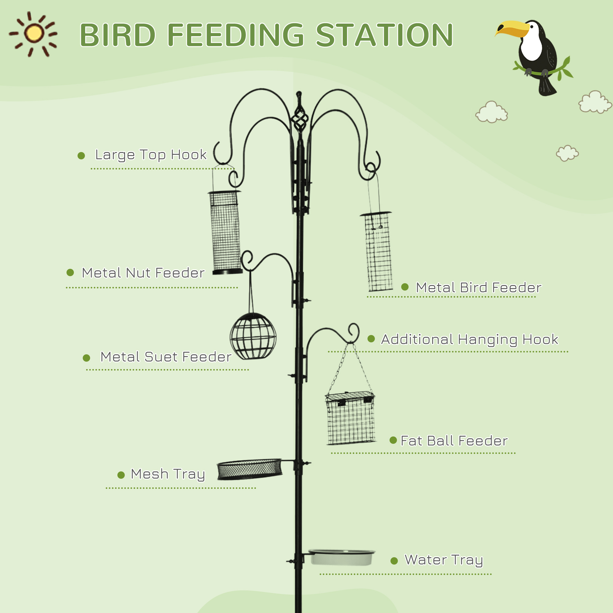 Attract a variety of birds by this bird feed station kit from PawHut. Features 6 hooks and 2 trays in total, providing various choices to place feeders. 4 different kinds of feeders are included for you. 4 prong base is stable and durable for reliable daily use. In addition, it's a great gift for parents, children and nature lovers. Put the bird feeding station outside your home near a window or in your patio and make a clear viewing angle to hours of delightful entertainment.