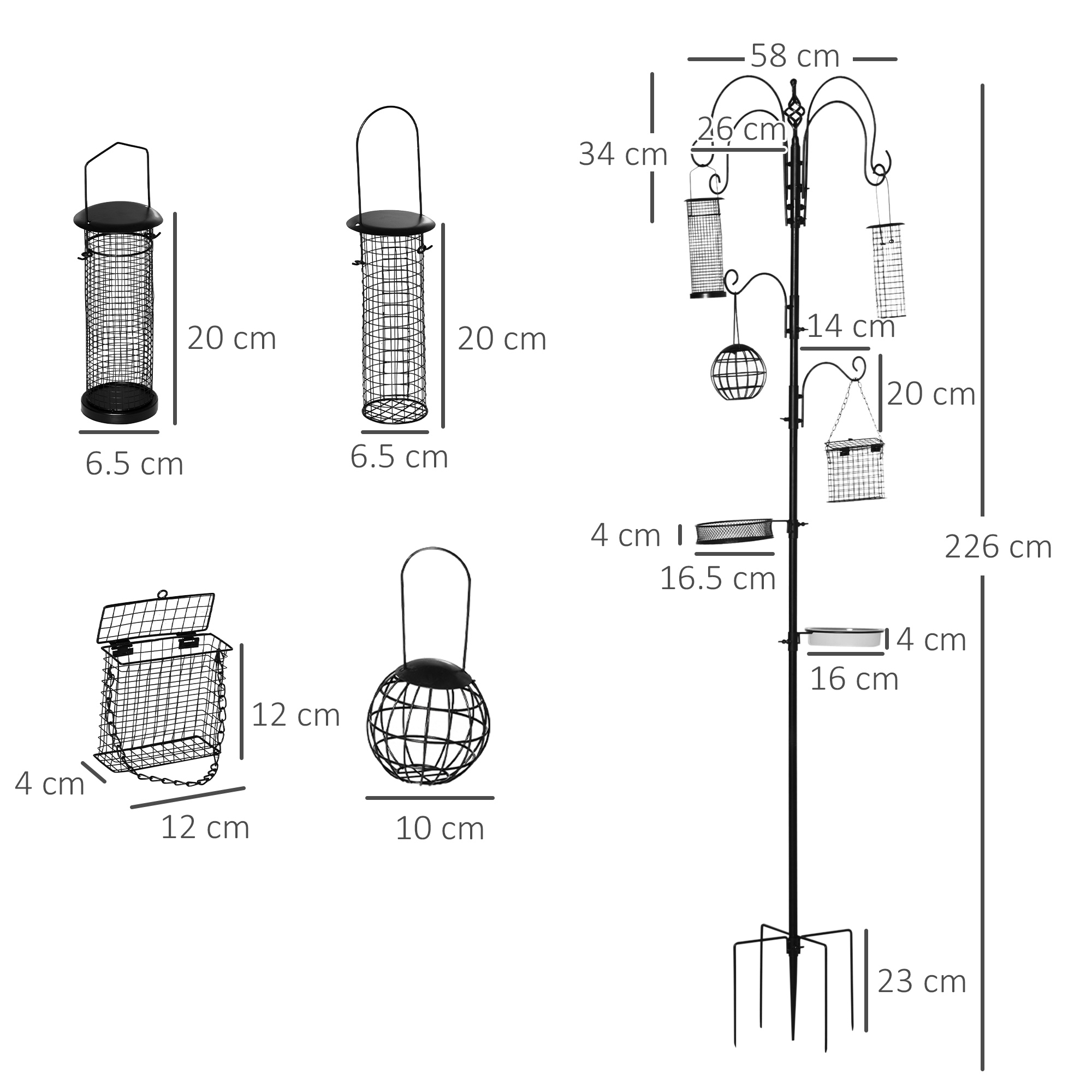 - Feeder Size: Φ6.5 x 20Hcm(metal bird feeder), Φ6.5 x 20Hcm(metal nut feeder), 12L x 4W x 12Hcm(metal suet feeder), Φ16.5 x 4Hcm(fat ball feeder)