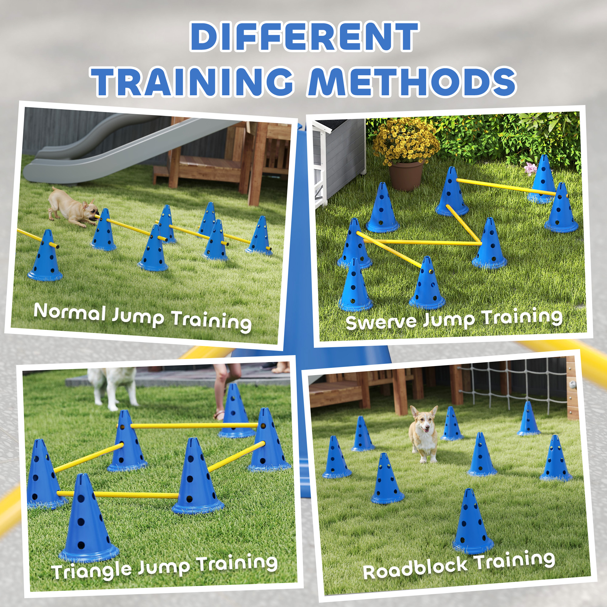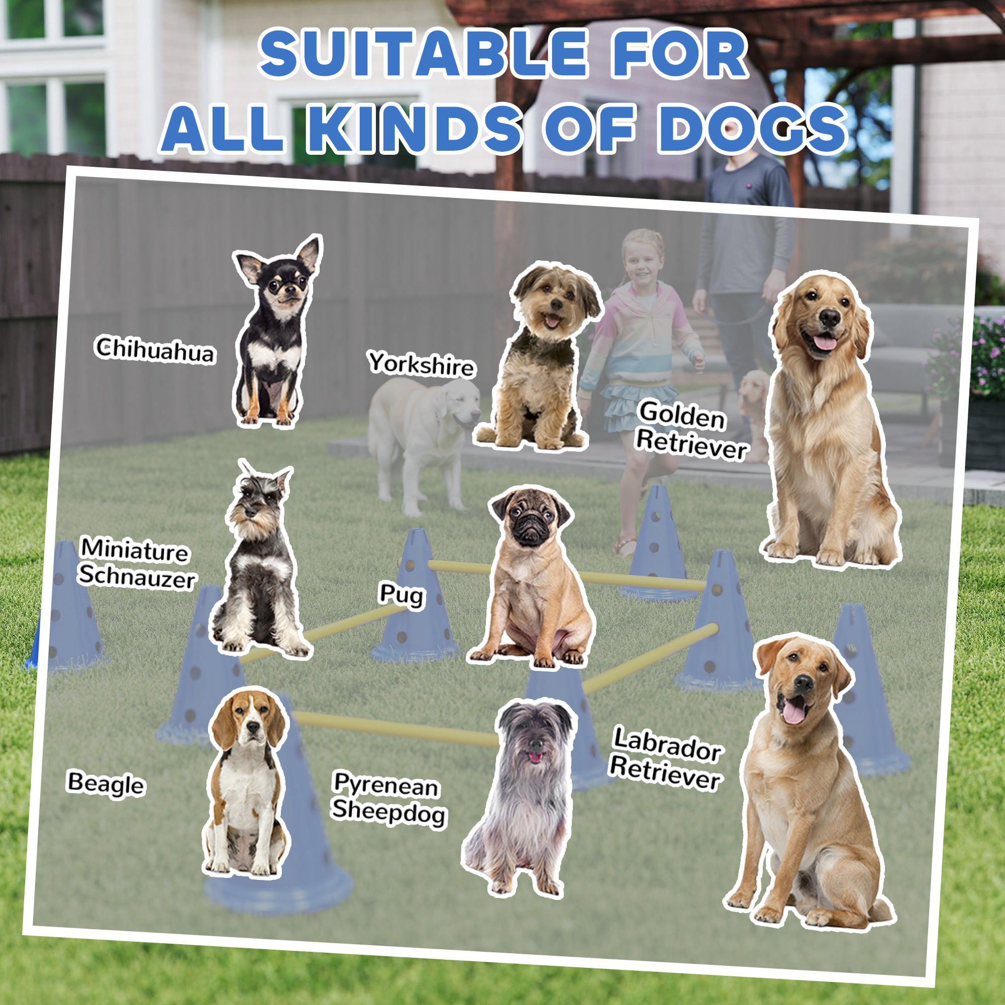 Train your dog with the PawHut pet agility set! Featuring four adjustable dog jumps to suit any size or skill level, this dog training equipment enhances concentration, fitness and agility. Made from safe, lightweight ABS, it's simple to assemble and disassemble and comes with a bag for easy transport. Whether in your garden or at the local park, you'll not only train your dog but also strengthen your bond!