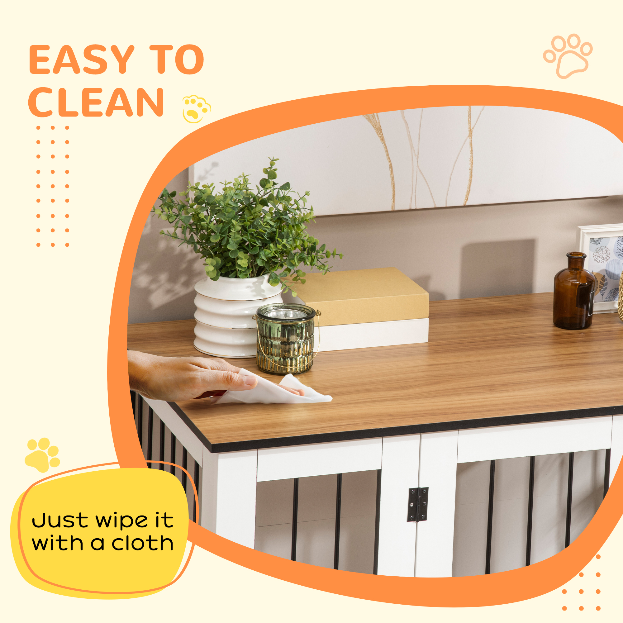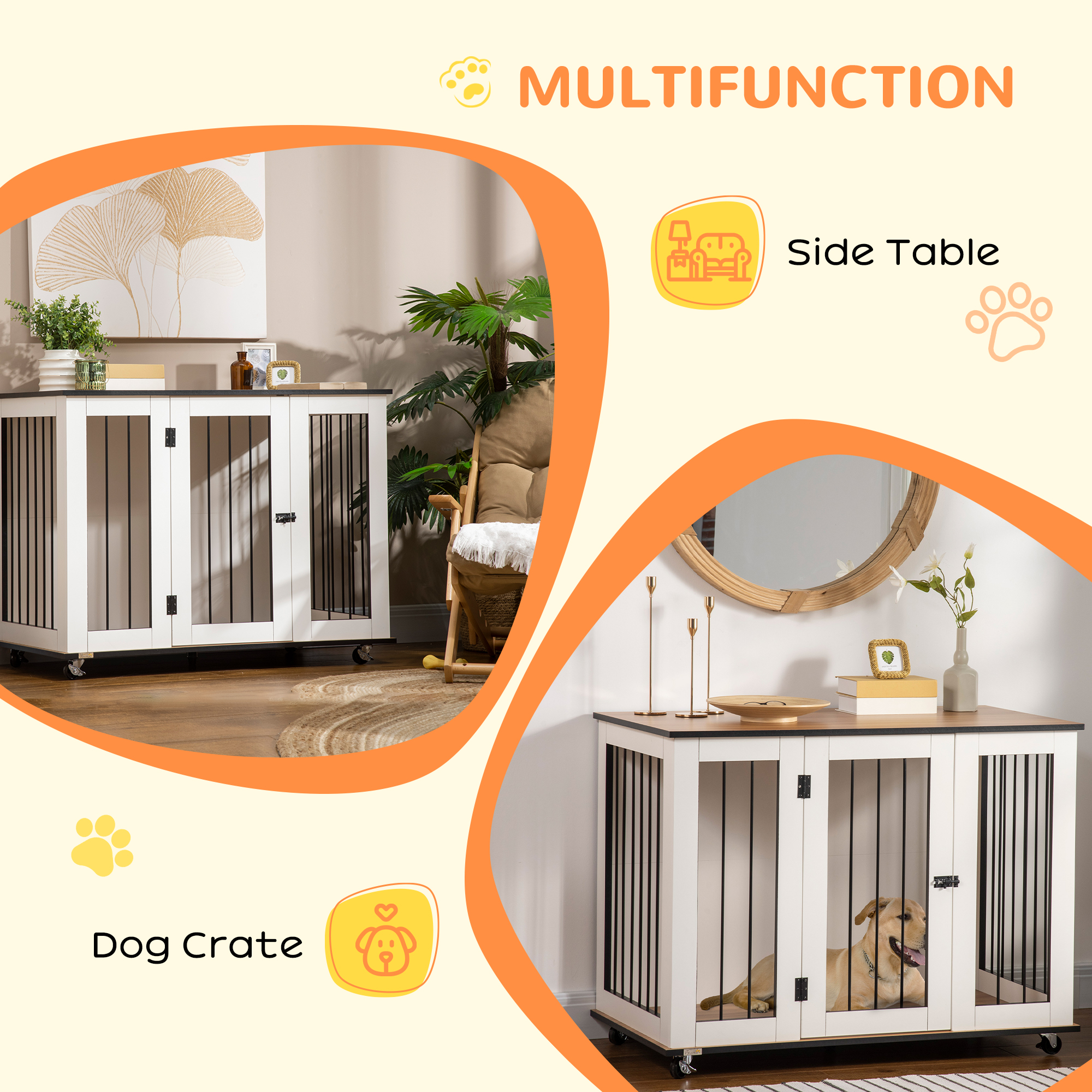 This stylish PawHut dog crate table, which acts as a side table too! Pets have a spot for relaxing, whilst you have a large top for displaying your favourite pieces. Wheels at the bottom for easy movement, you can roll it around the home, keeping pets nearby if needed. Steel bars on the windows for ventilation, whilst the raised floor stops dampness and moisture from seeping through, keeping pets comfortable. Finished with lockable doors for security, pets are safe and secure when inside.