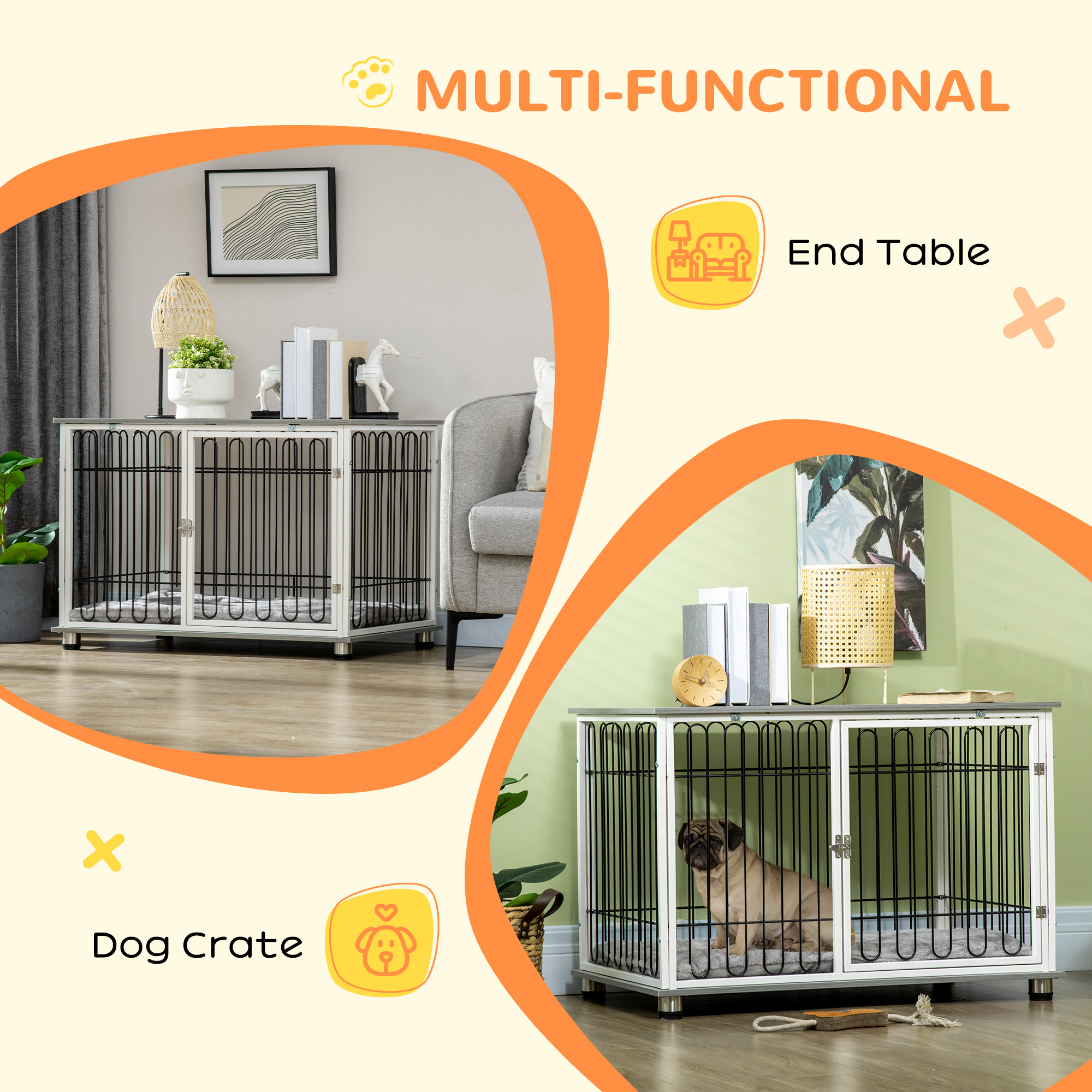 This PawHut dog crate cage, fused with a side table, is perfect for when you need pets to stay put. It's a spacious crate with a cushioned bottom for added comfort, whilst the steel wire keeps their space well ventilated – it also lets them look out, so they don't feel trapped. The latch keeps them securely inside, giving you peace of mind. Finished with a wide top, which can be used for displaying your favourite pieces, bringing style into your home. Something for you and pets to enjoy.