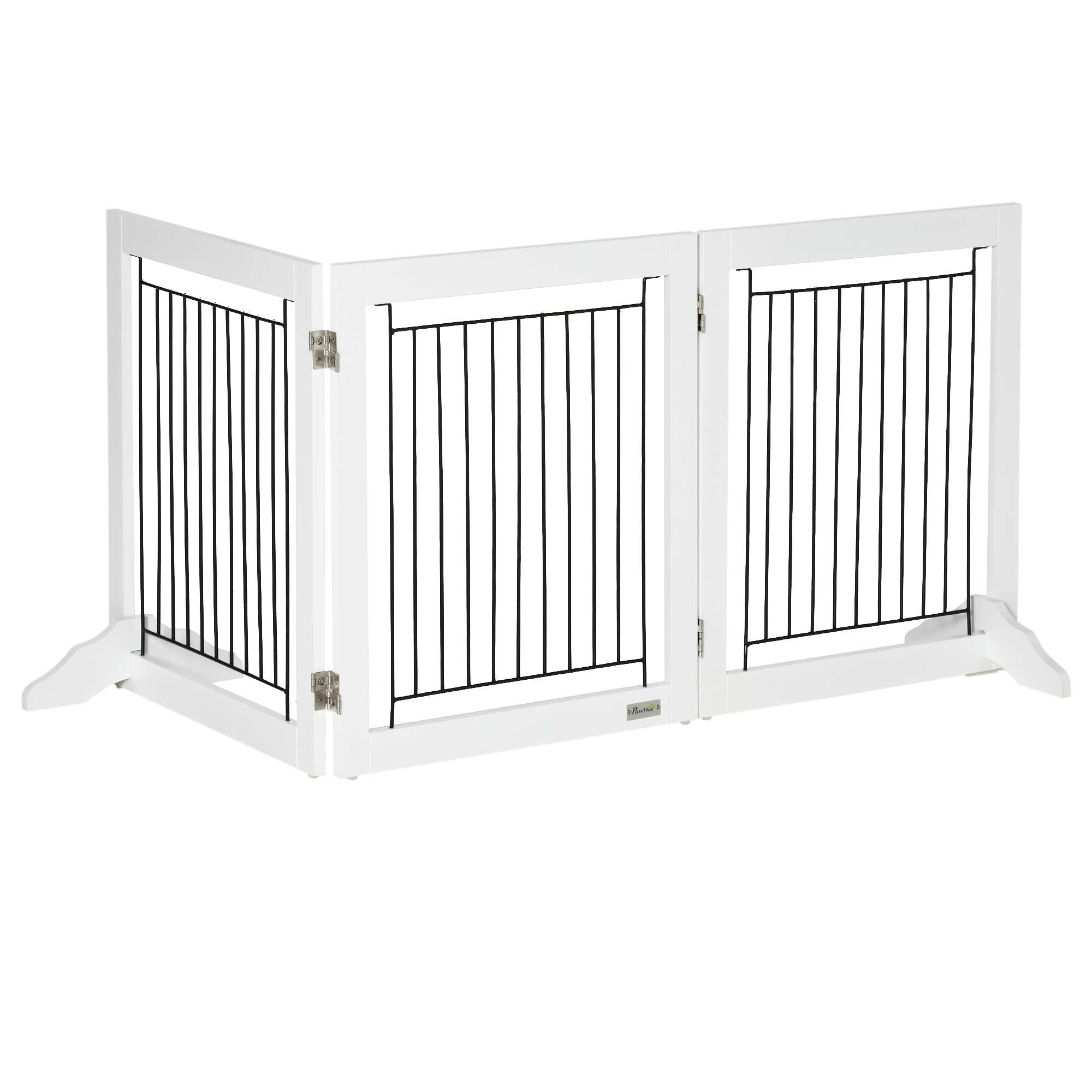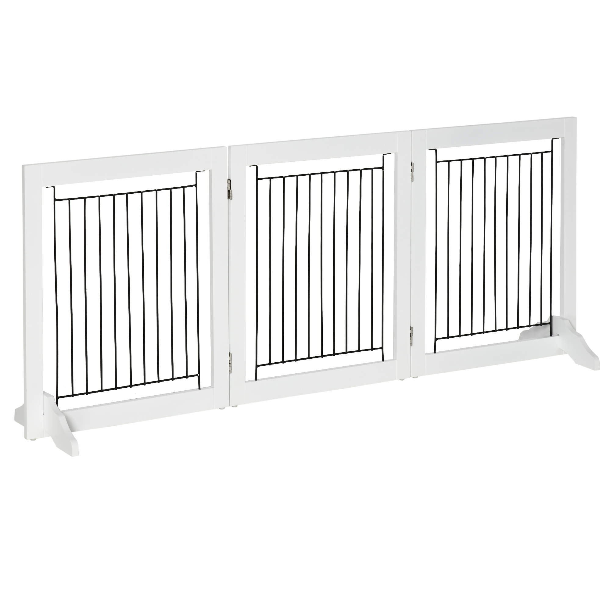 With this PawHut dog fence, keeping pets in an area is safe and simple. Made from MDF and steel it's strong and stable, whilst the support feet keep it stable and balanced, ensuring it stays up right. Consisting of three panels, it's fixed together with strong hinges – the shape can be changed to suit different sized rooms. When not in use, fold the gate to store and save space. It's a brilliant way to make sure pets won't go to places they shouldn't.