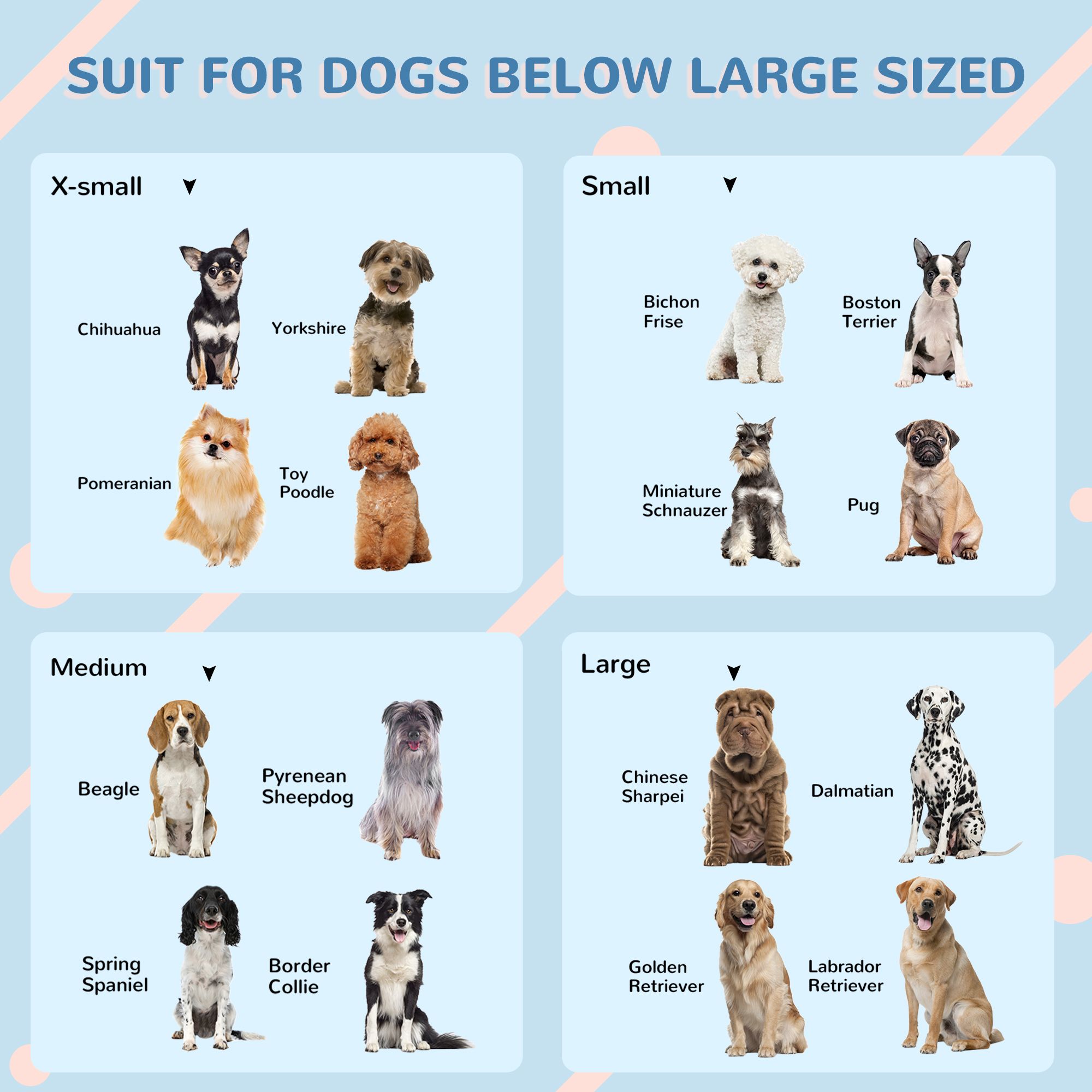 - Suitable for large dogs up to 30kg, 60cm in body length and 50cm in shoulder height. Suitable breeds include Siberian Huskies, Chinese Shar Peis, Dalmatians and other similar-sized pets