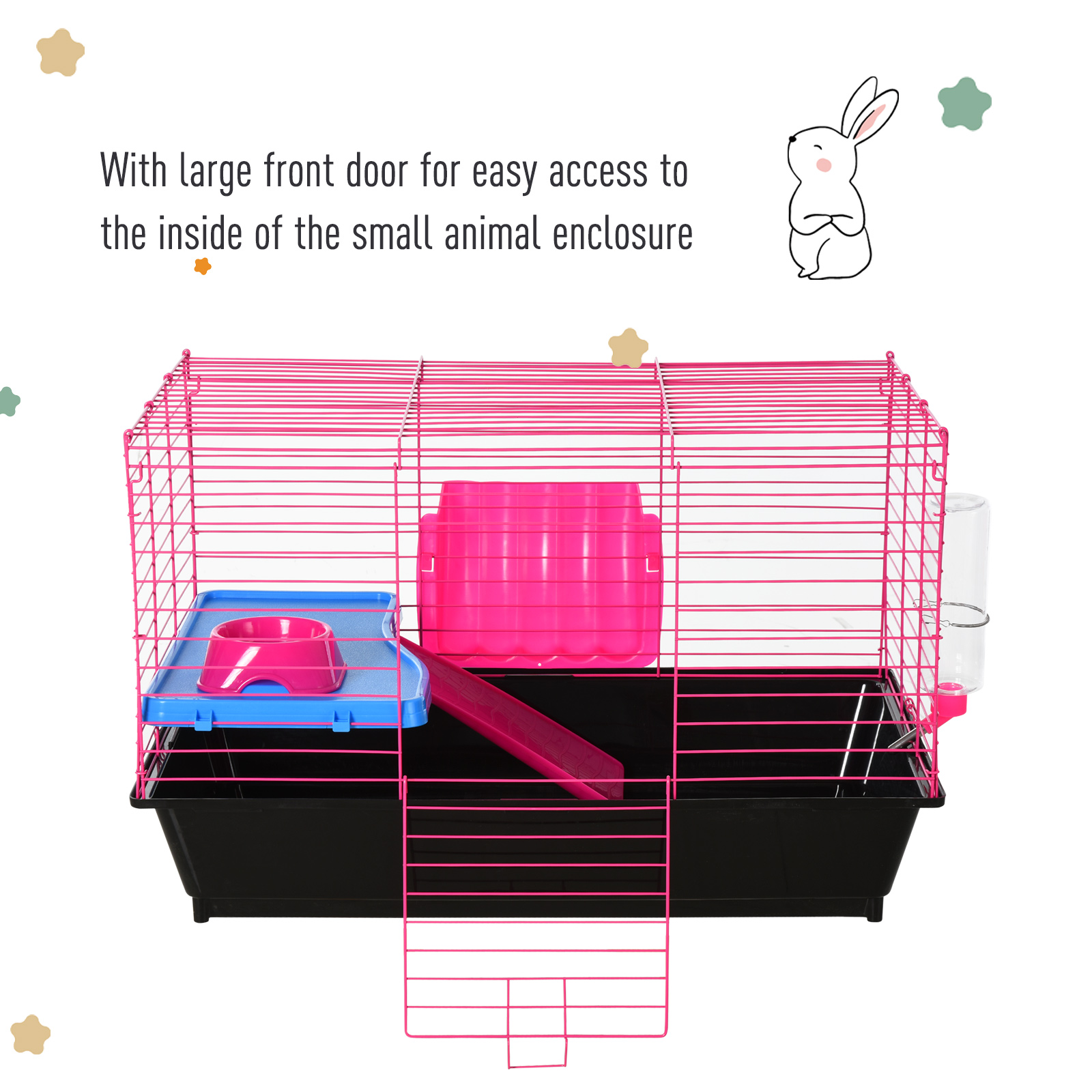 Give your small pet their own safe haven with this cage from PawHut. In a colourful pink and blue design, it is made with a large living area, protected by metal wire casing, keeping them safely inside and allowing the air to flow through. Inside features a small platform with a food bowl, a water bottle, a ramp and a hay feeder, giving them everything they need to stay happy, hydrated and fed. It's finished with a deep base, which collects dirt and debris, with a large door for easy access. Perfect for Rats, Hamsters, Chinchillas and more.