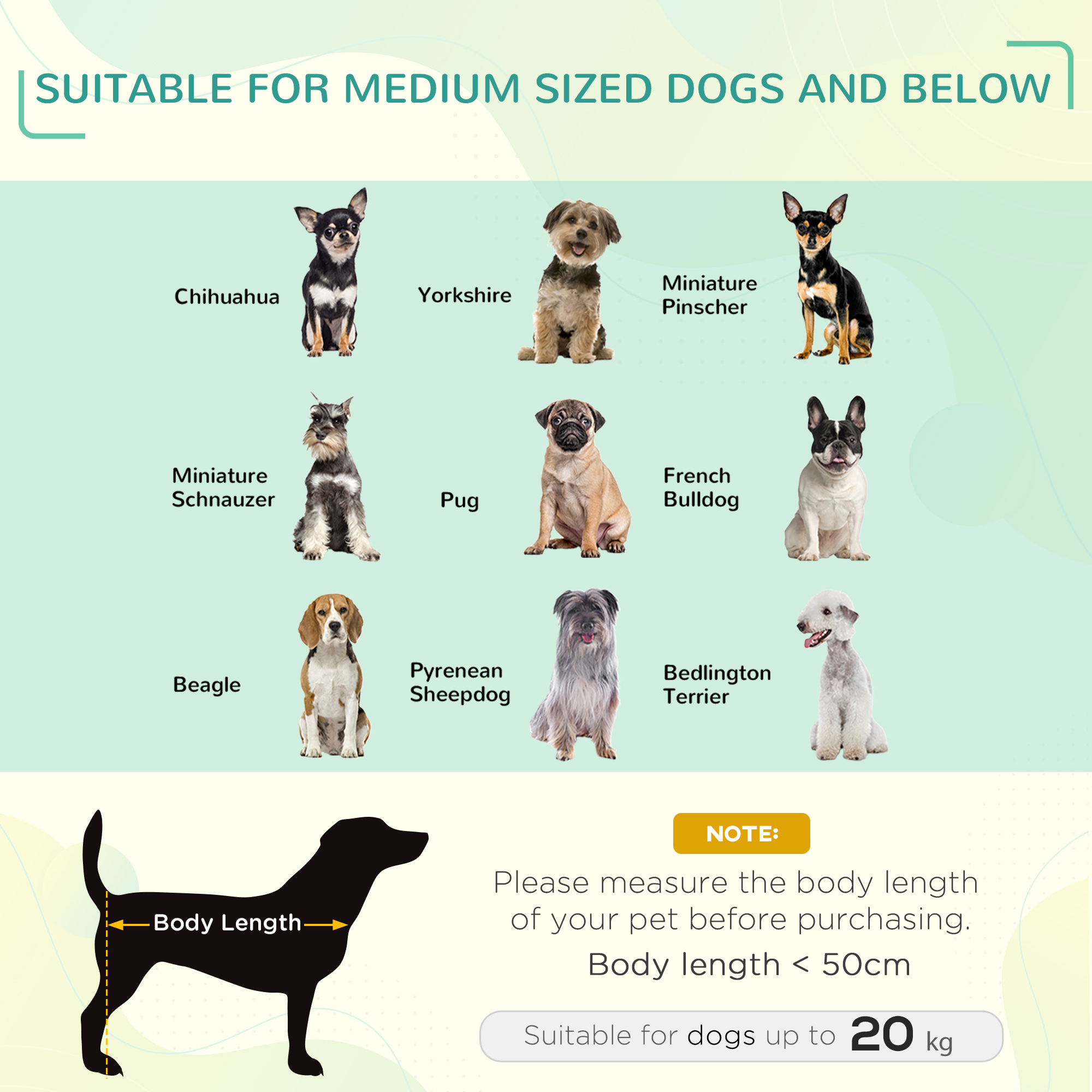 - Suitable for medium dogs less than 50 cm in length and under 20 kg in weight