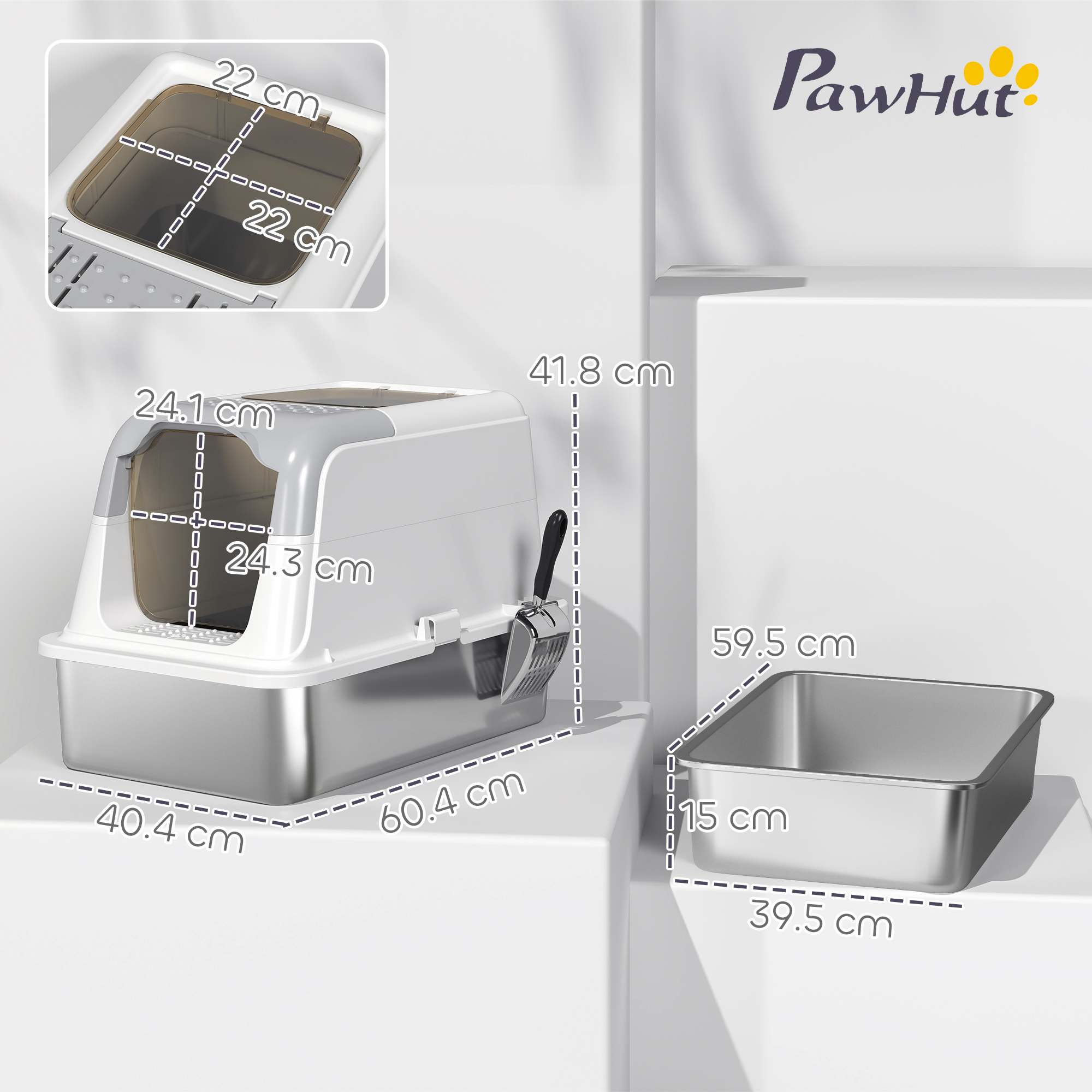 - Litter Tray: 59.5L x 39.5W x 15H cm