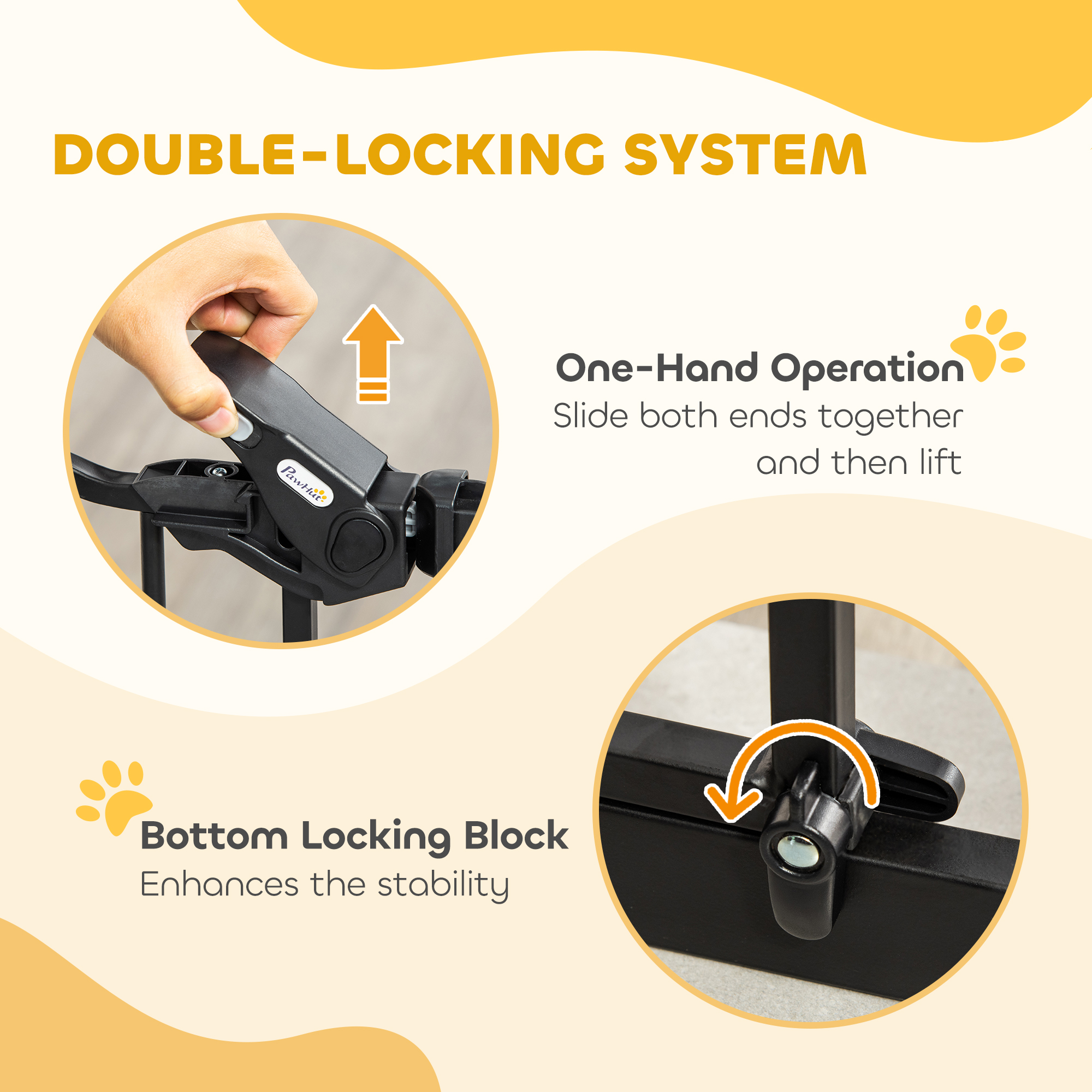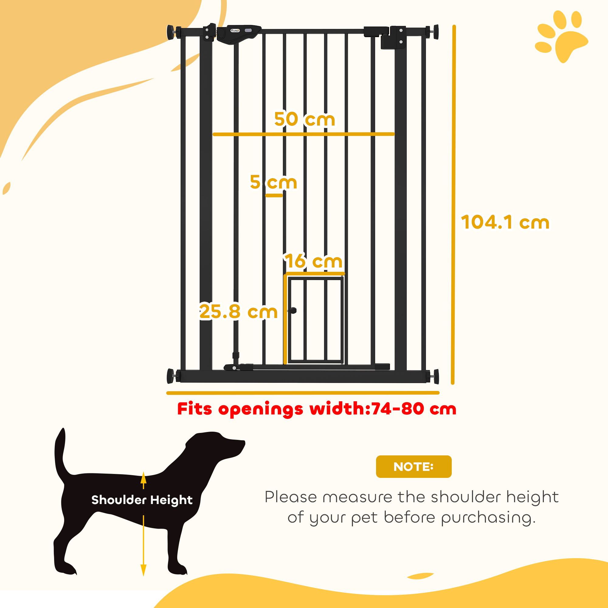Keep pets away from rooms when required with this PawHut pet stair gate. Made from sprayed metal with lead-free treated surface for strength and safety. 74cm to 80cm wide, allows to fit into different sized spaces with ease while 104.1cm high - the extra tall gate makes it difficult for pets to get over. Slide and lift, the handle is easy to open, allowing you to pass through quickly without your pet escaping for security. Cat door provides a secure separation between cats and dogs.