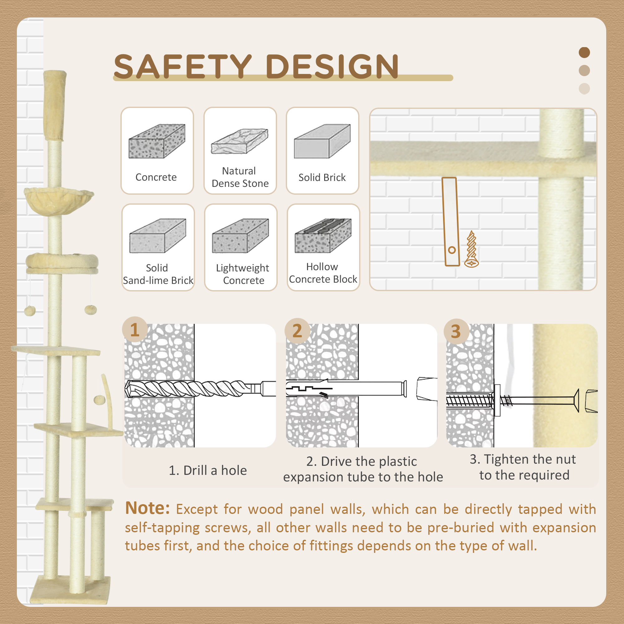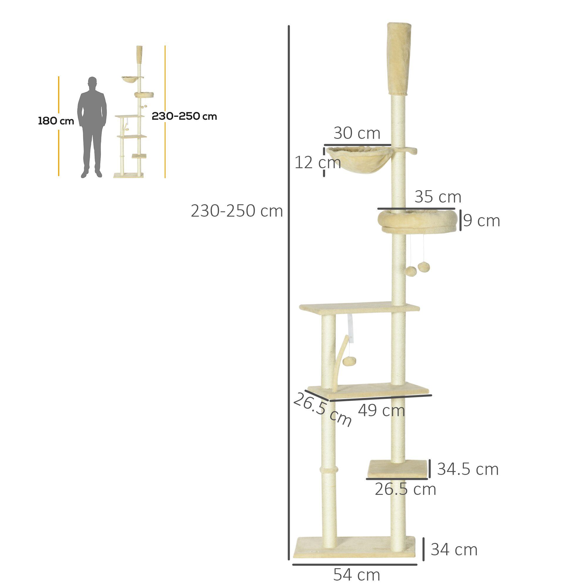 - Note: This cat tower needs to be attached to the ceiling for added safety and is designed for ceilings under 250cm in height.