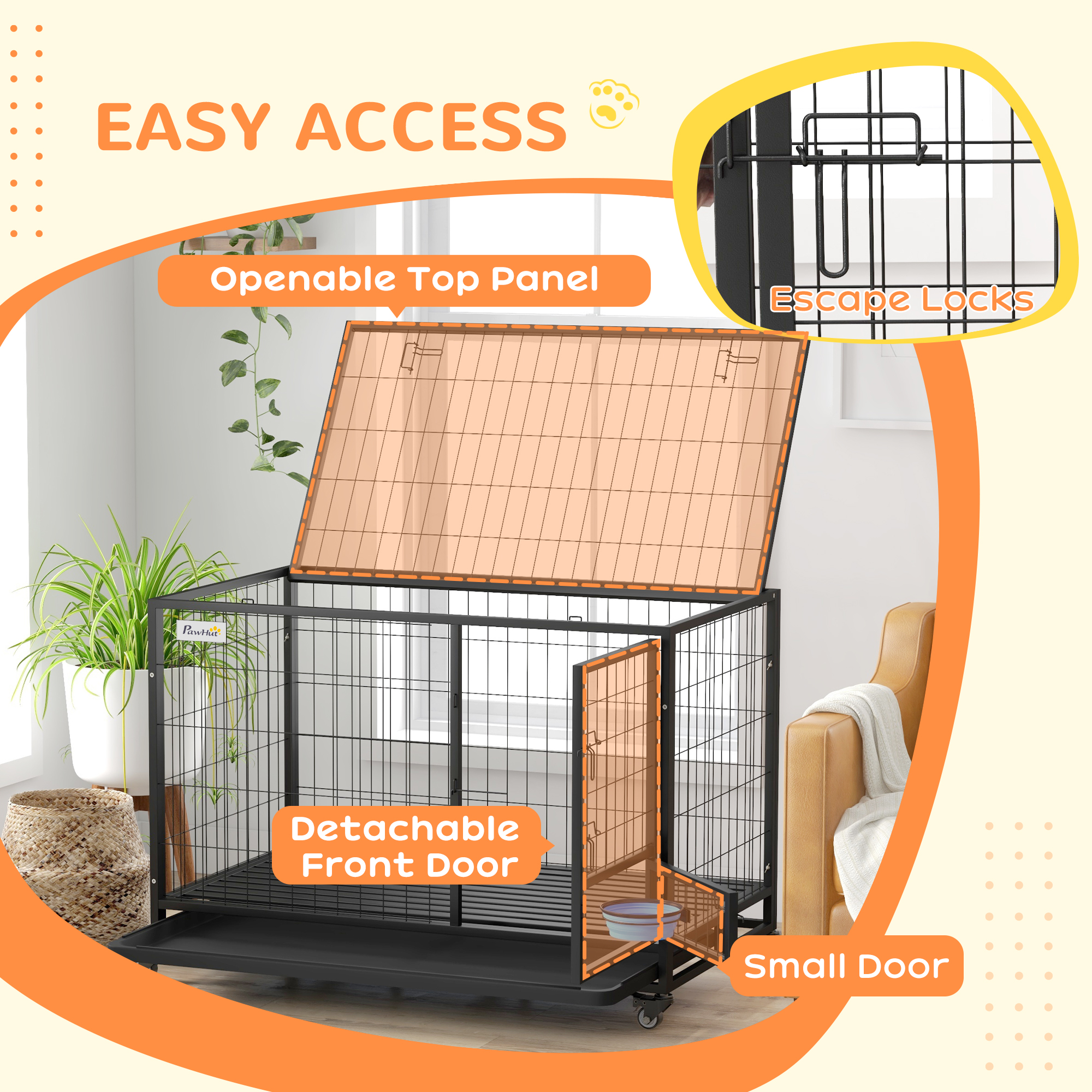 Who let the dogs out? Not you, thanks to this PawHut dog crate. A space where comfort meets convenience, its flat tube bottom provides a cosy retreat, whist the included bowl and holder ensure pets never go hungry. The large door provides easy access – the locks keep them securely inside when needed. Plus, there's a smaller door, so they can enjoy a quick snack. Finished with wheels at the bottom, you'll wheel the crate from room to room, so your pets are always by your side.