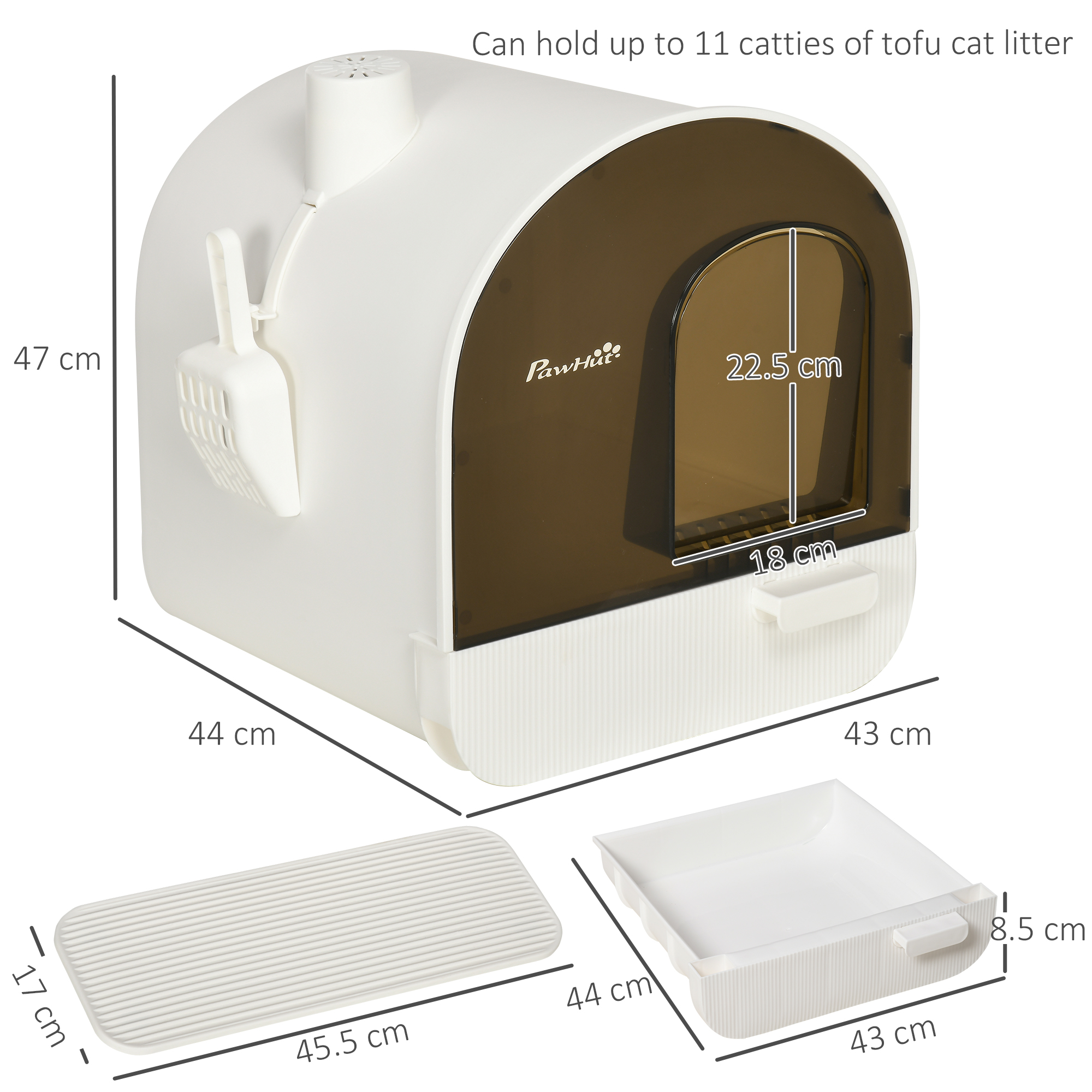 Improve your pet's litter experience with this PawHut litter box. Cats love their privacy, so this enclosed design is great – they'll use it without the fear of being watched. The cat toilet also stops unpleasant odours from spreading. The removable tray and scoop make cleaning a breeze – when done, place the scoop on the side, so you don't lose it. The front plastic plate catches litter, so pets won't carry it around the house. A compact and stylish piece, it's a must-have for all cat owners.
