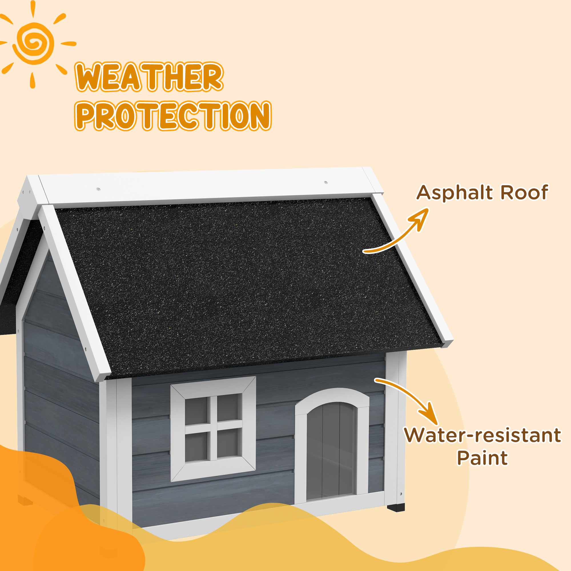 A safe home for pets to relish in, this PawHut cat house is a great outdoor addition for cats who love the outdoors. Designed for comfort and safety, it features three doors for easy access, two of which have curtains for added privacy. A clear window ensures proper ventilation and visibility, while the openable roof allows for simple cleaning. The water-resistant asphalt roof provides excellent shelter, keeping pets cool and dry all year round. Pets will love their own space to relax and play.