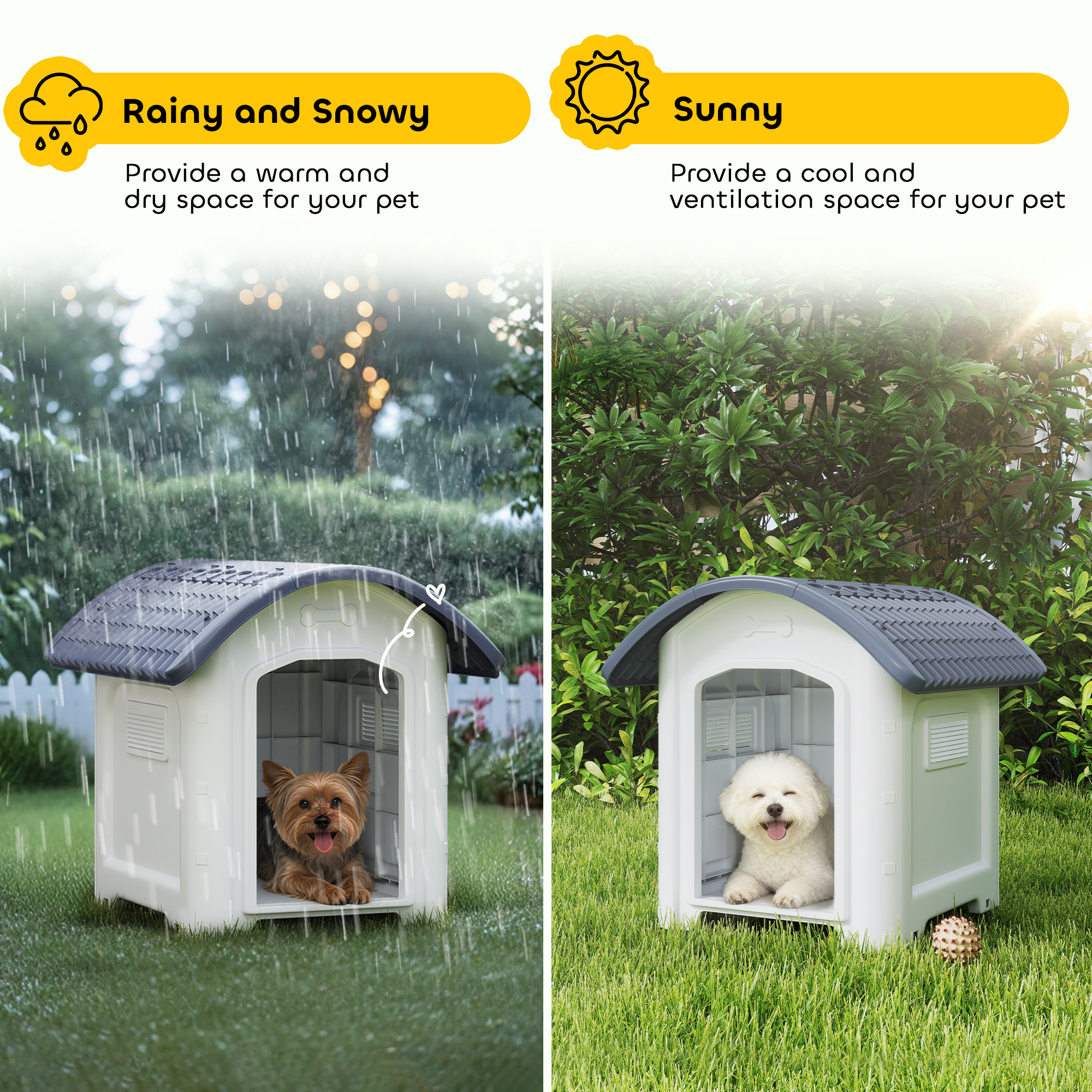 Worrying about sudden rain or stifling summer heat? Your pet's outdoor retreat can become a source of stress. This PawHut dog house offers a solution. Its waterproof, ventilated design keeps your companion dry and cool, providing a reliable dog shelter. Plus, the easy-to-clean structure means less work for you and more quality time together, ensuring peace of mind no matter the weather.