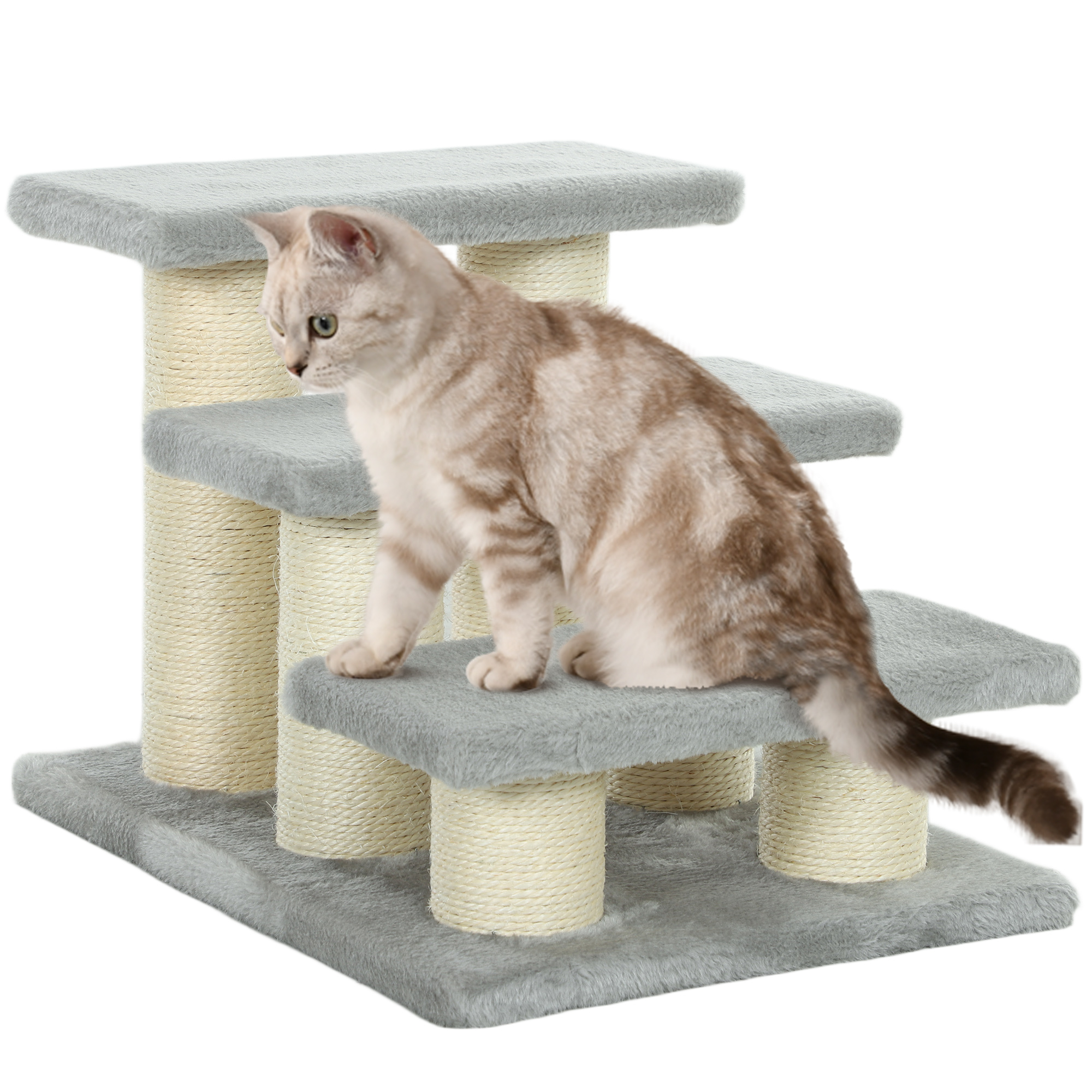 This fun and helpful staircase from PawHut helps make it easy for small or ageing pets to climb safely to a higher spot. The frame is made from solid particle boards, each step is wrapped with a soft plush cover, providing a gentle surface that is soft on paws to reduce pain while climbing. Scratching posts with sisal ropes help sharpen cat's claw and protects your furniture at the same time.